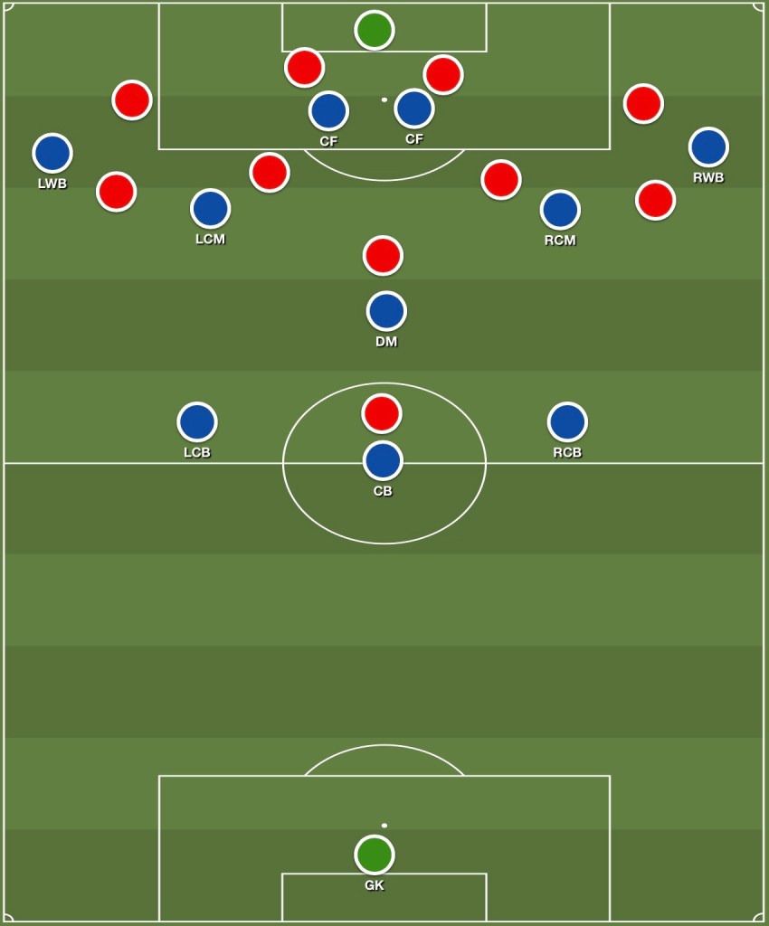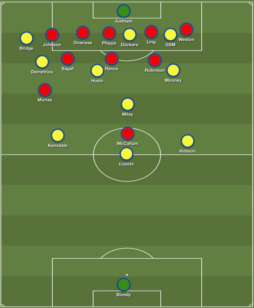 As you can see from the above, our ‘rest defence’ consists of our back three with Miley just in front: a 3-1 structure. Our two centre midfielders position themselves in the half spaces on either side, our wing backs occupy the wide spaces and we’re left with two players in the penalty area.