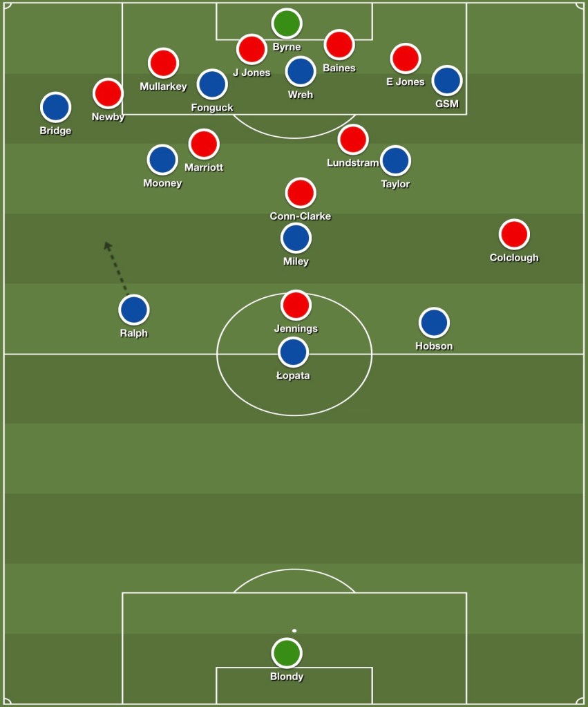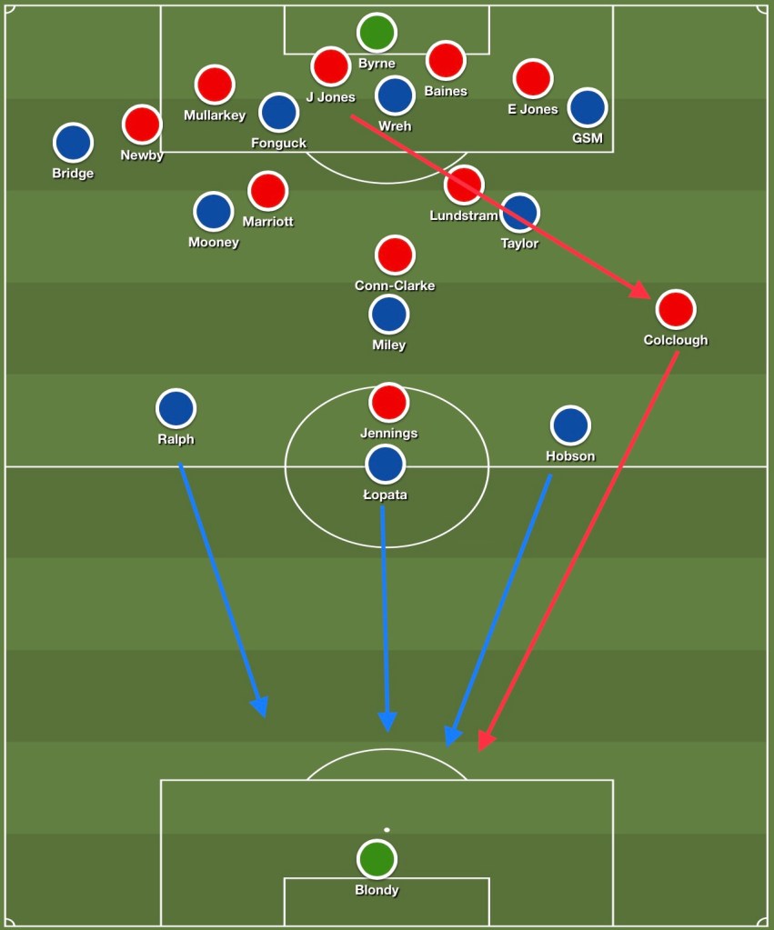 Once the ball goes out to Colclough, Shaun Hobson can come across to stop him having a clear run at our goal, leaving both Kacper Łopata and Ralph to mark Jennings. Conn-Clarke should hopefully be occupied by Miley, and then it’s just a case of us getting our other players back quicker than Altrincham can get their players forward – if we haven’t already won possession back.