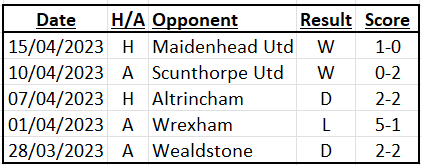 Clockwise: Maidenhead Utd (15/04/23), Scunthorpe Utd (10/04/23), Altrincham (07/04/23).