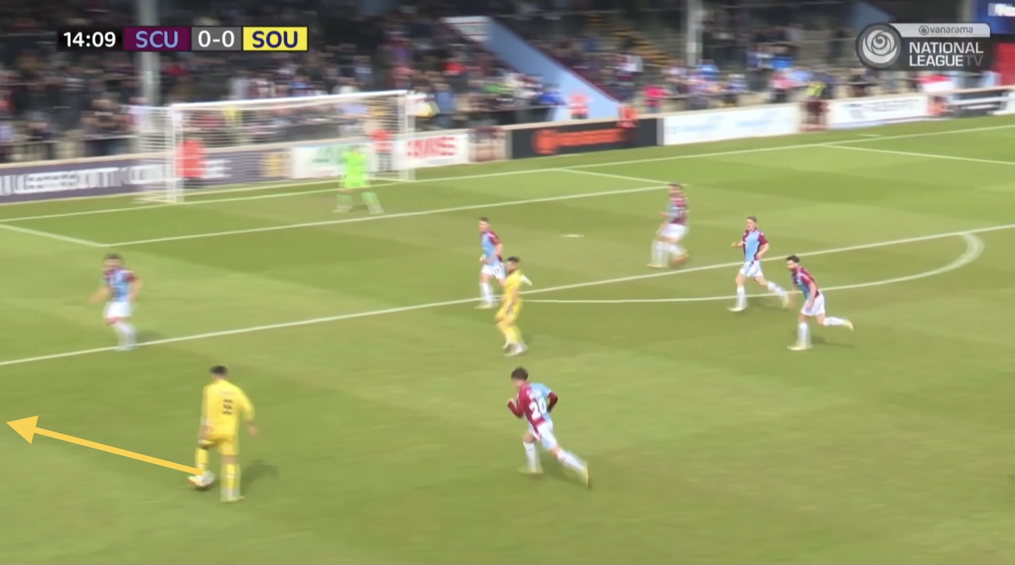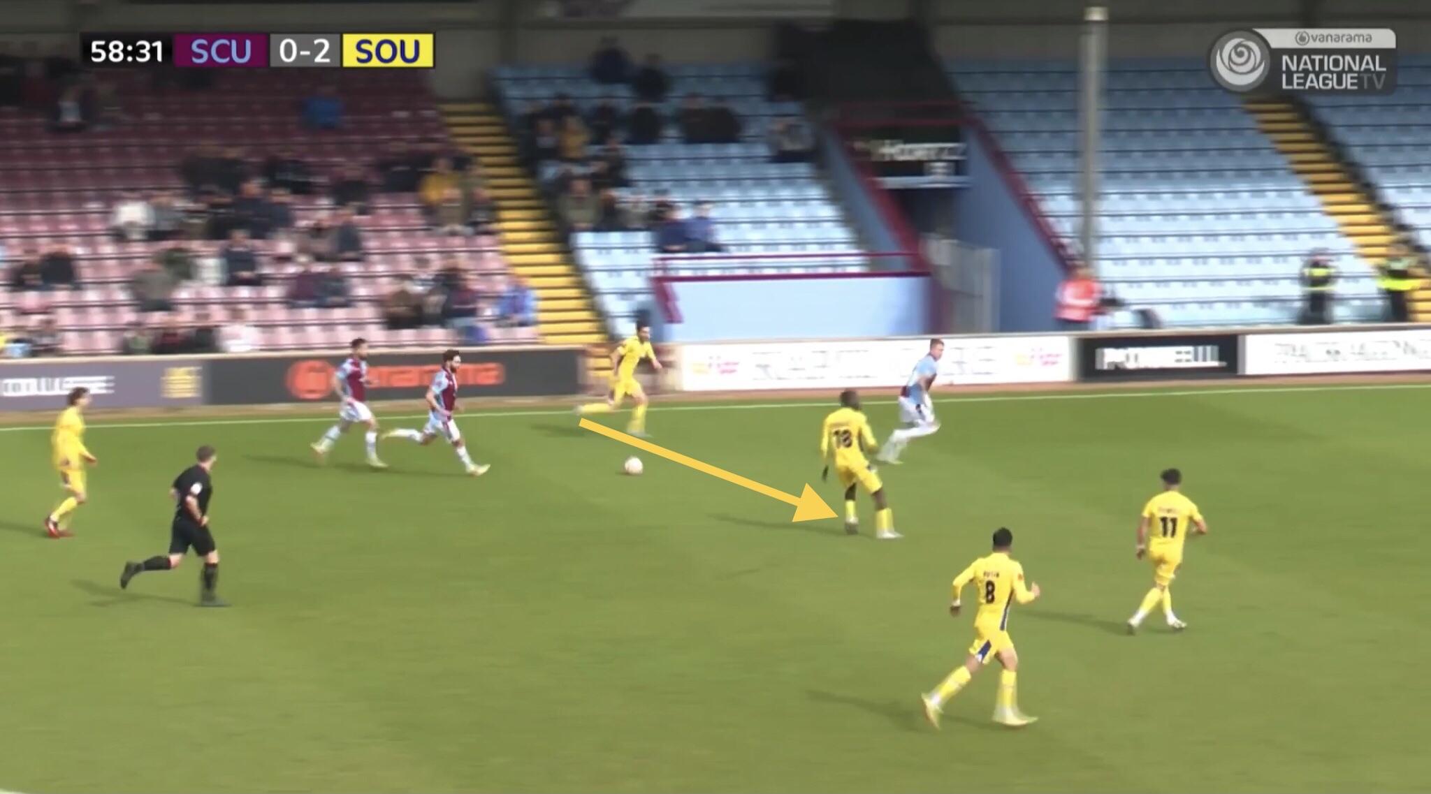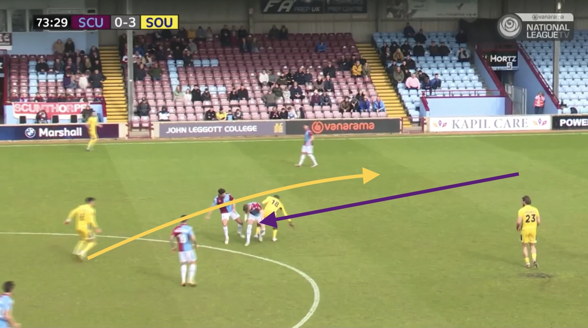 In this instance, Fonguck receives a pass between Scunthorpe’s defence and midfield, bringing a Scunthorpe central midfielder with him in the process. He’s able to lay the ball off to Cardwell, who’s shot is blocked and goes out for a corner kick.