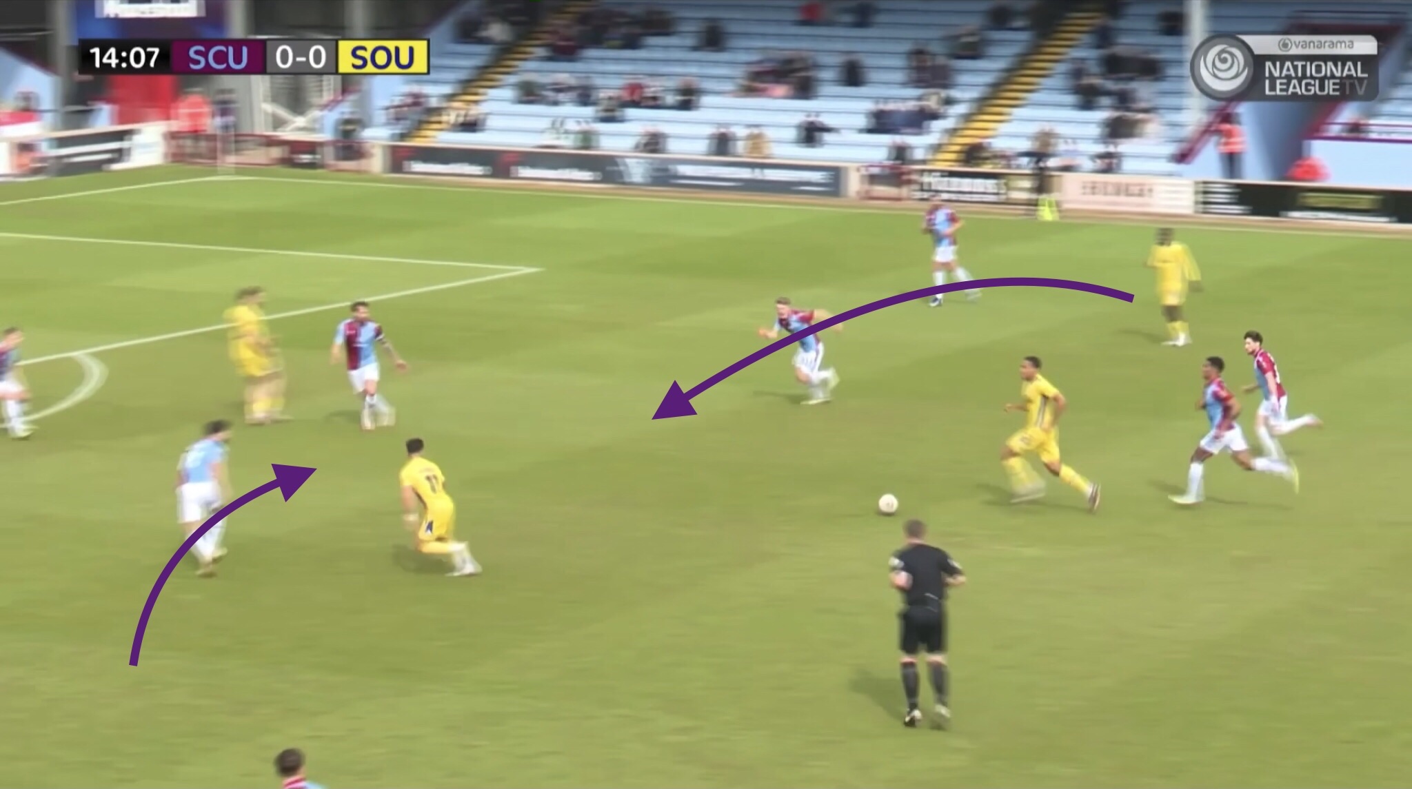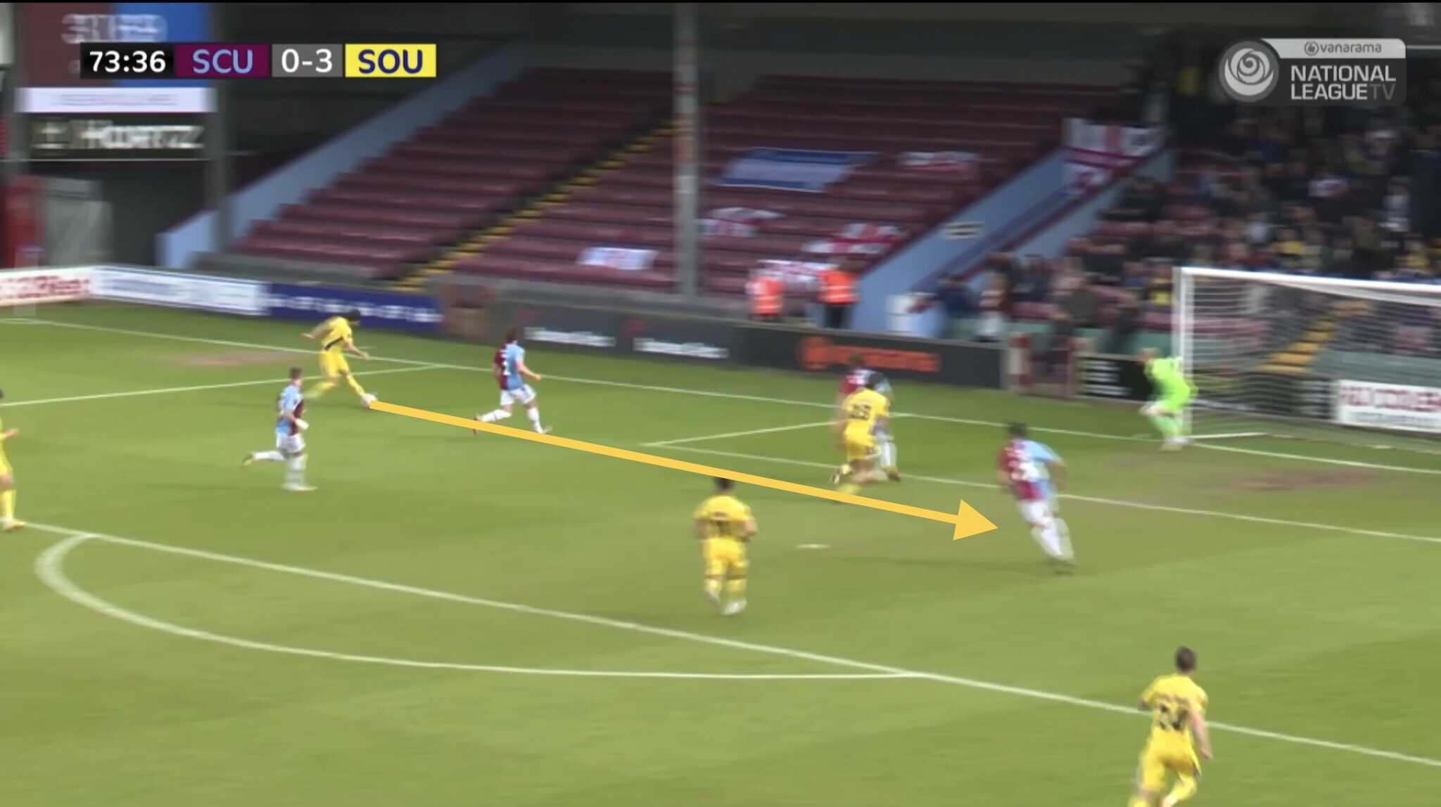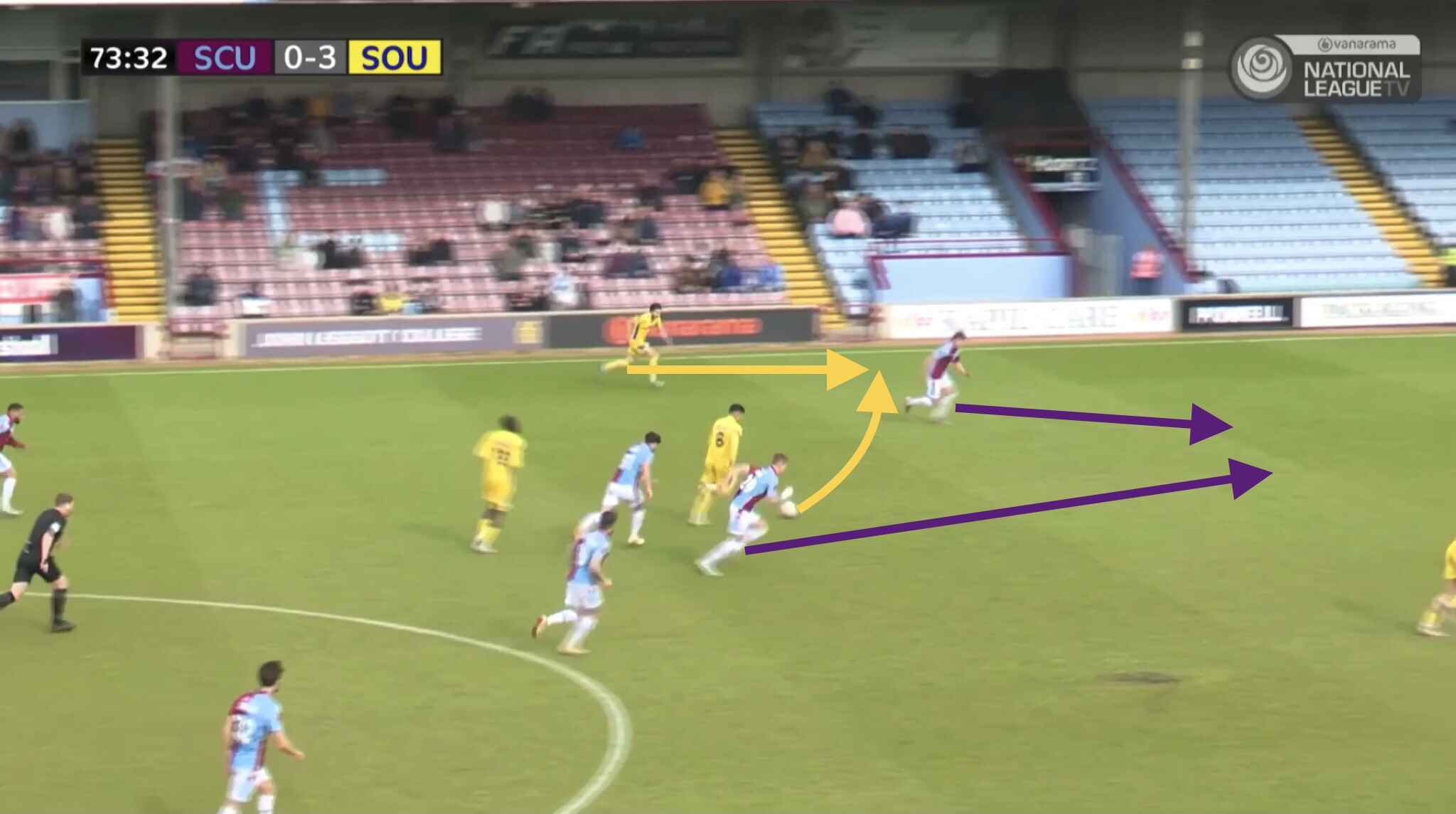 The final example shows Fonguck again receiving a pass between the lines. He draws a Scunthorpe centre back out of position as he has positioned himself between their defence and midfield. Husin picks ball up and drives into space which has been vacated by the centre back.