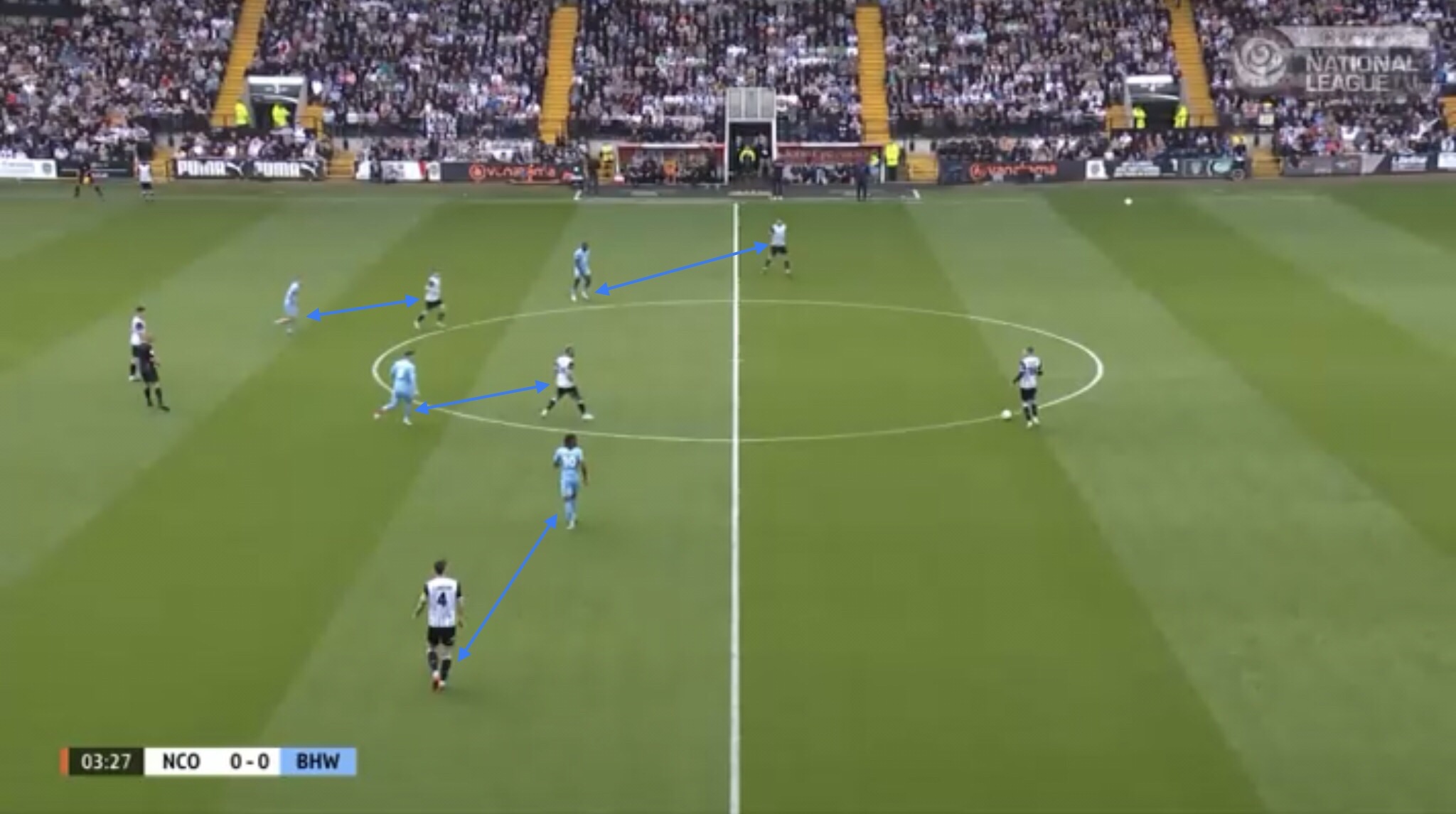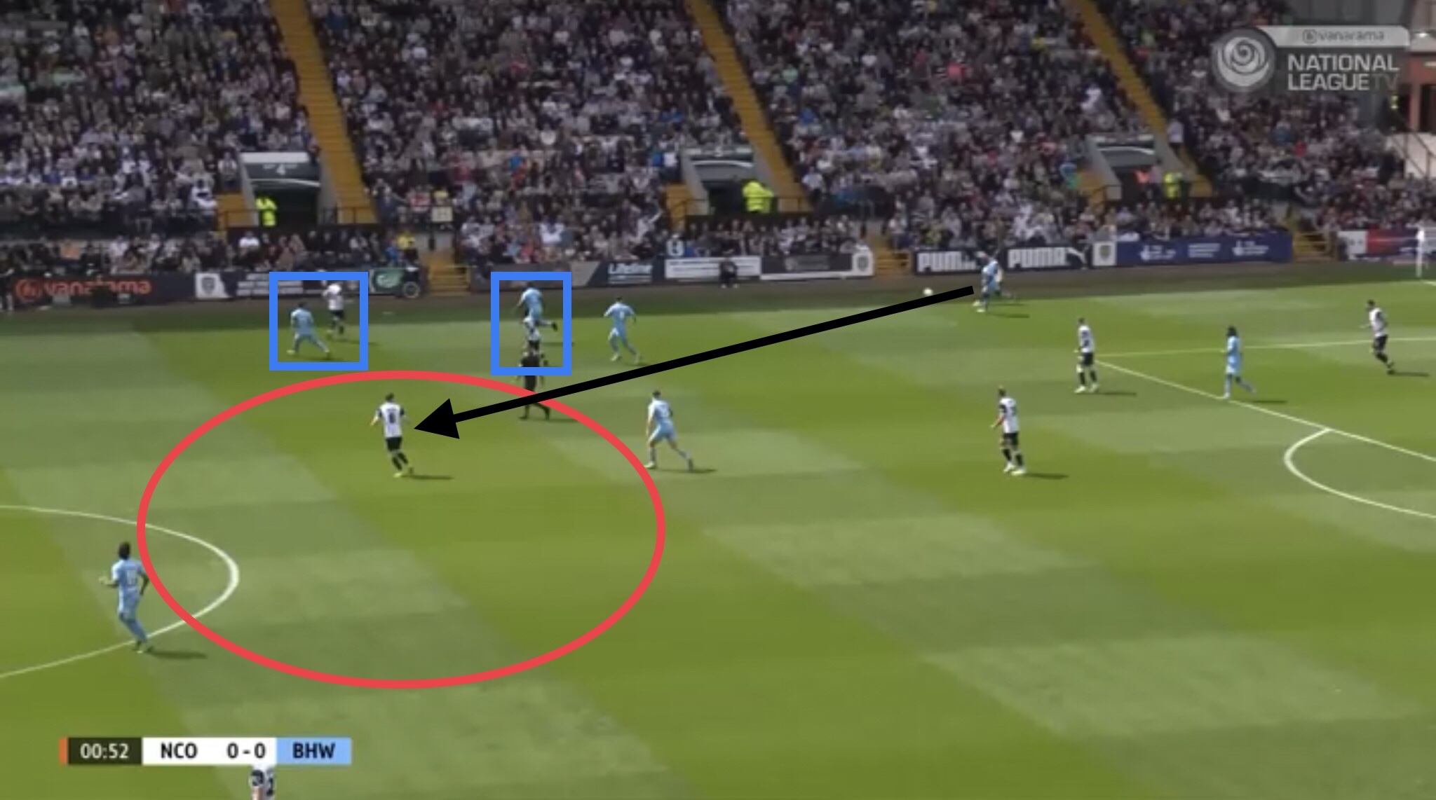 This was another way Notts managed to play through Boreham Woodâs press. With Boreham Wood man marking, when Notts managed to do this, it meant there was space in the half spaces for them to exploit, either side of the compact central area of the pitch.