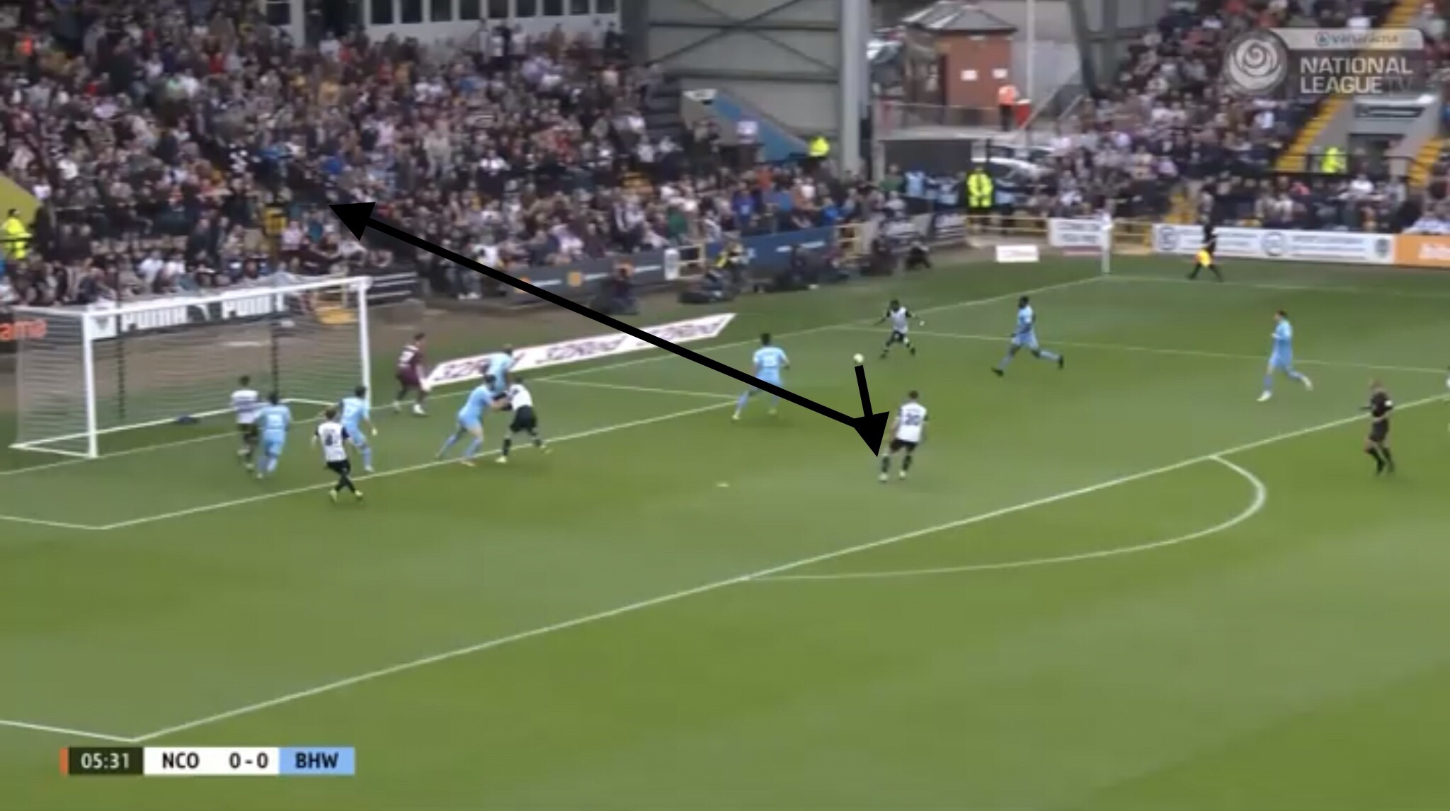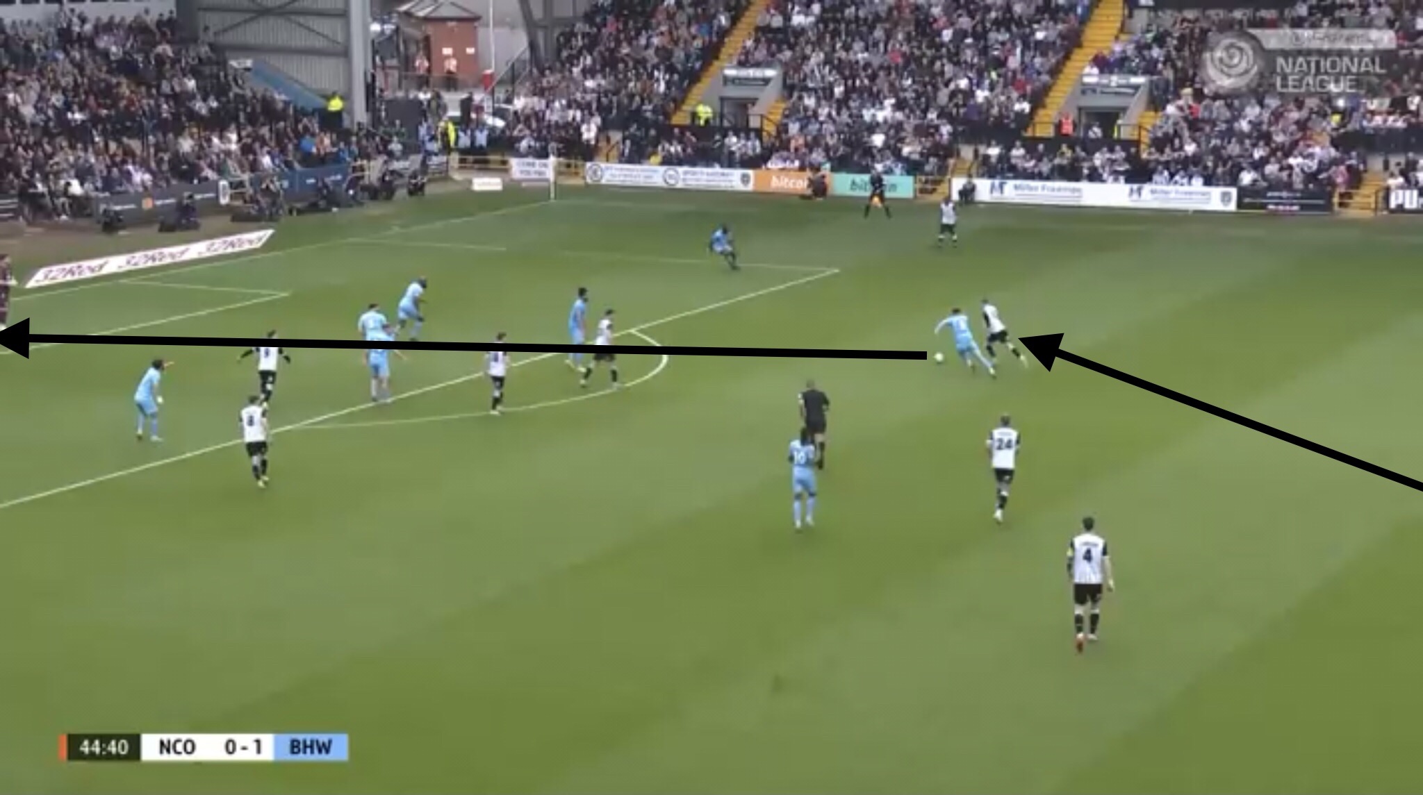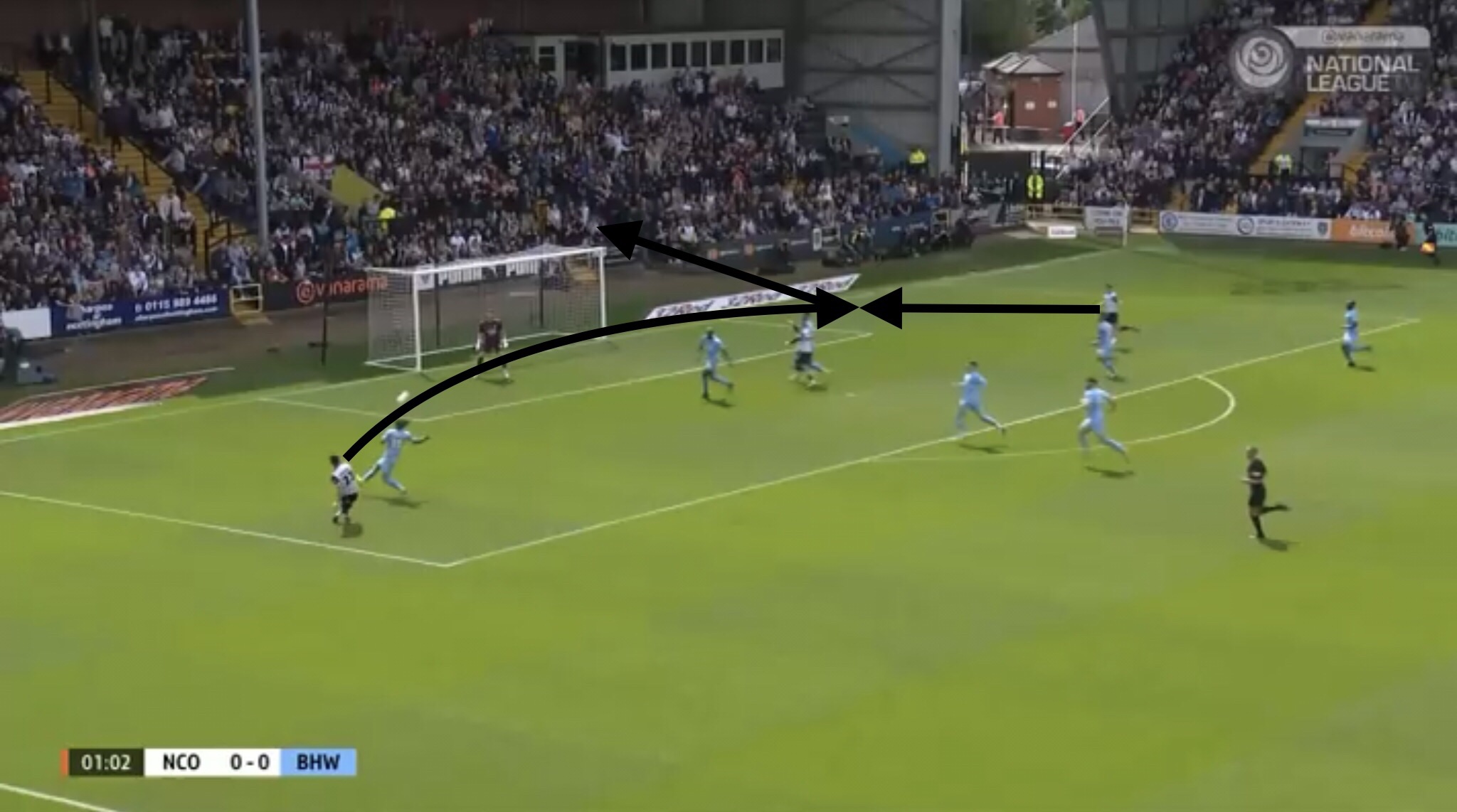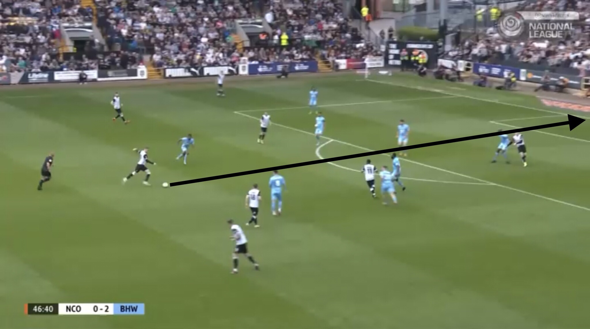 Hereâs an example, with Boreham Wood switching the play diagonally towards a striker. They managed to win a free kick on this occasion, presenting them with an opportunity to get the ball into the Notts penalty area.