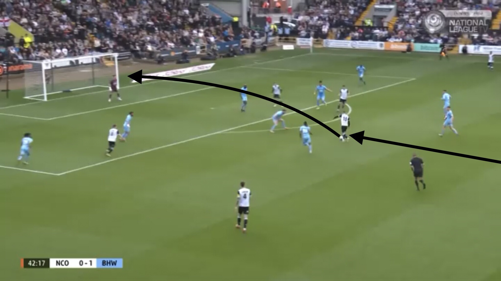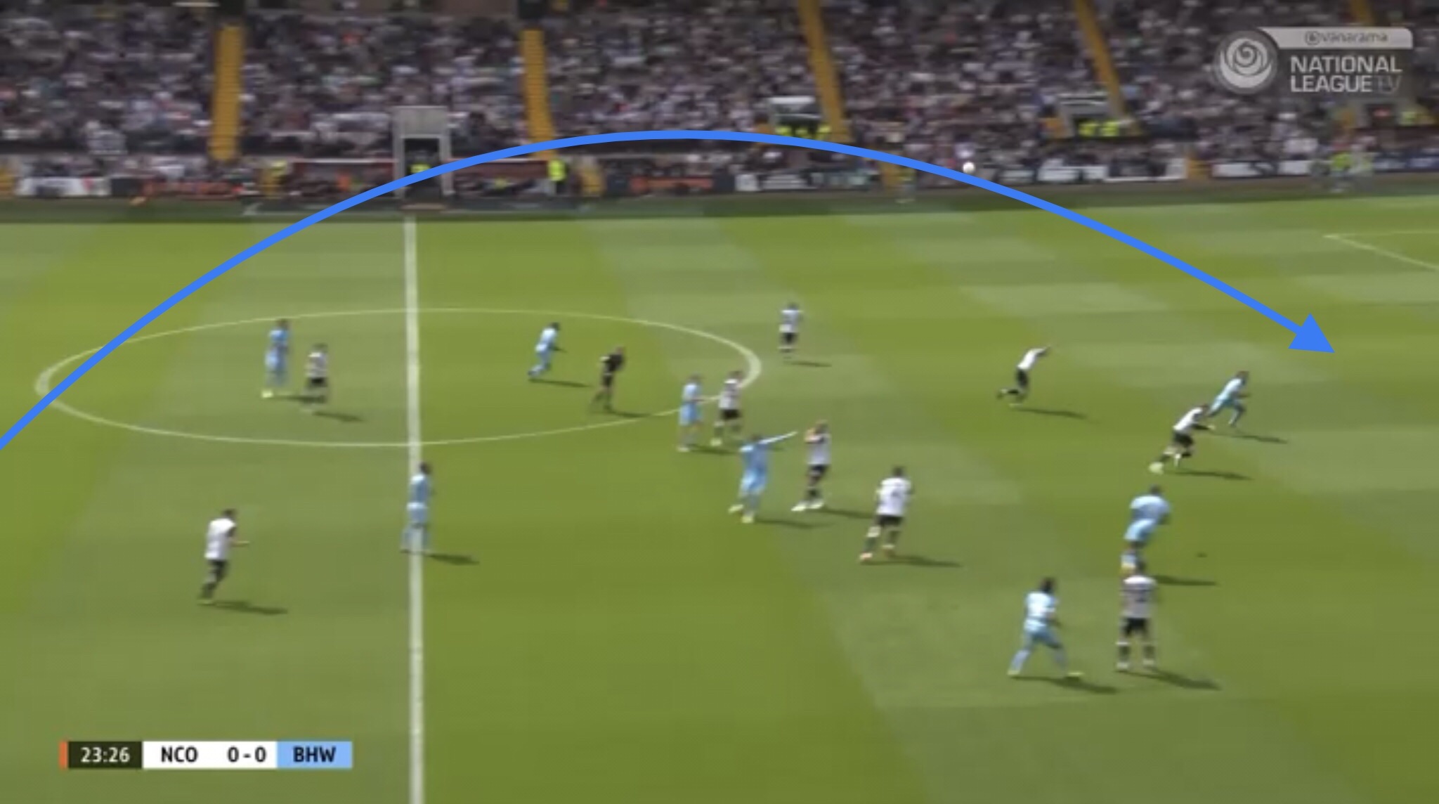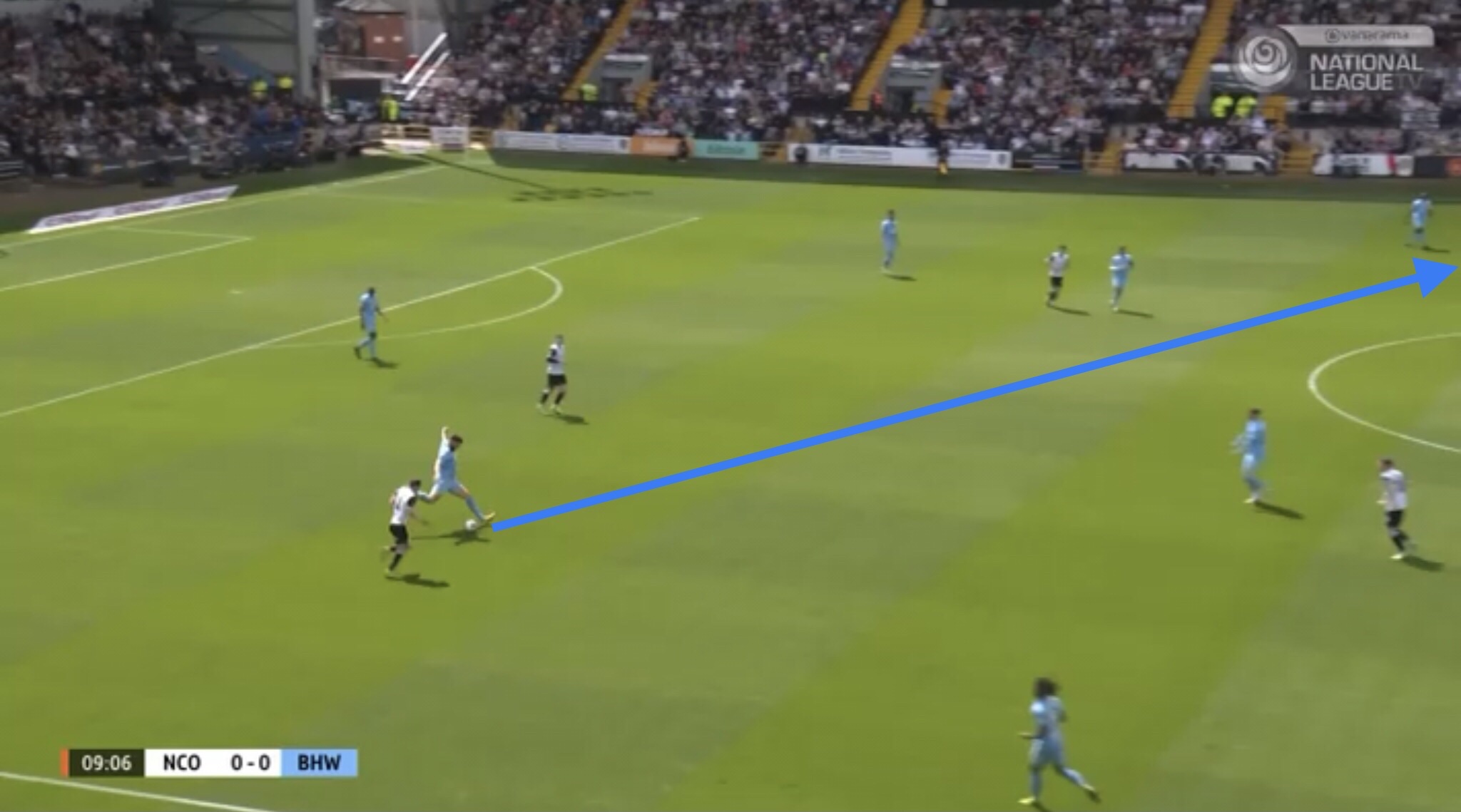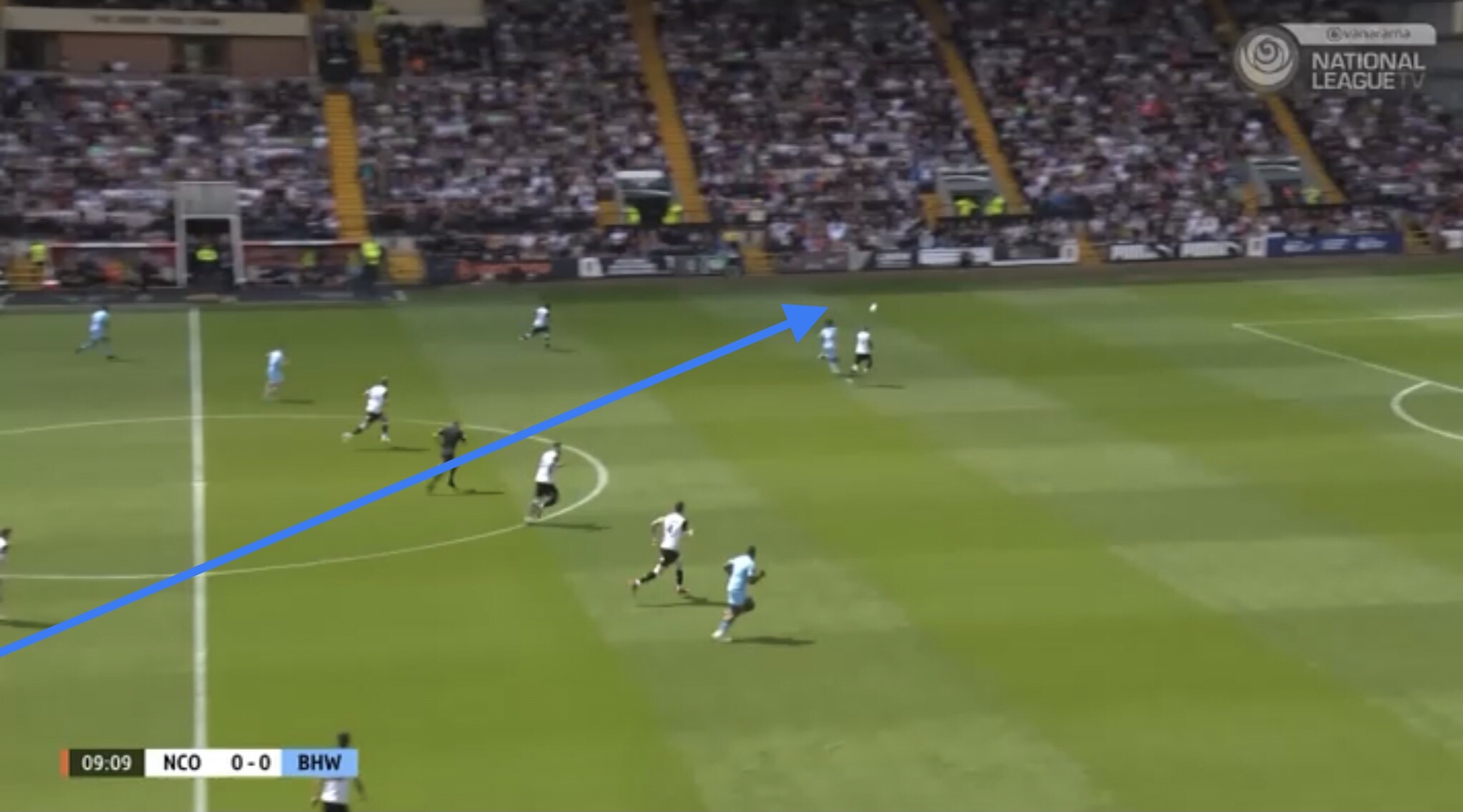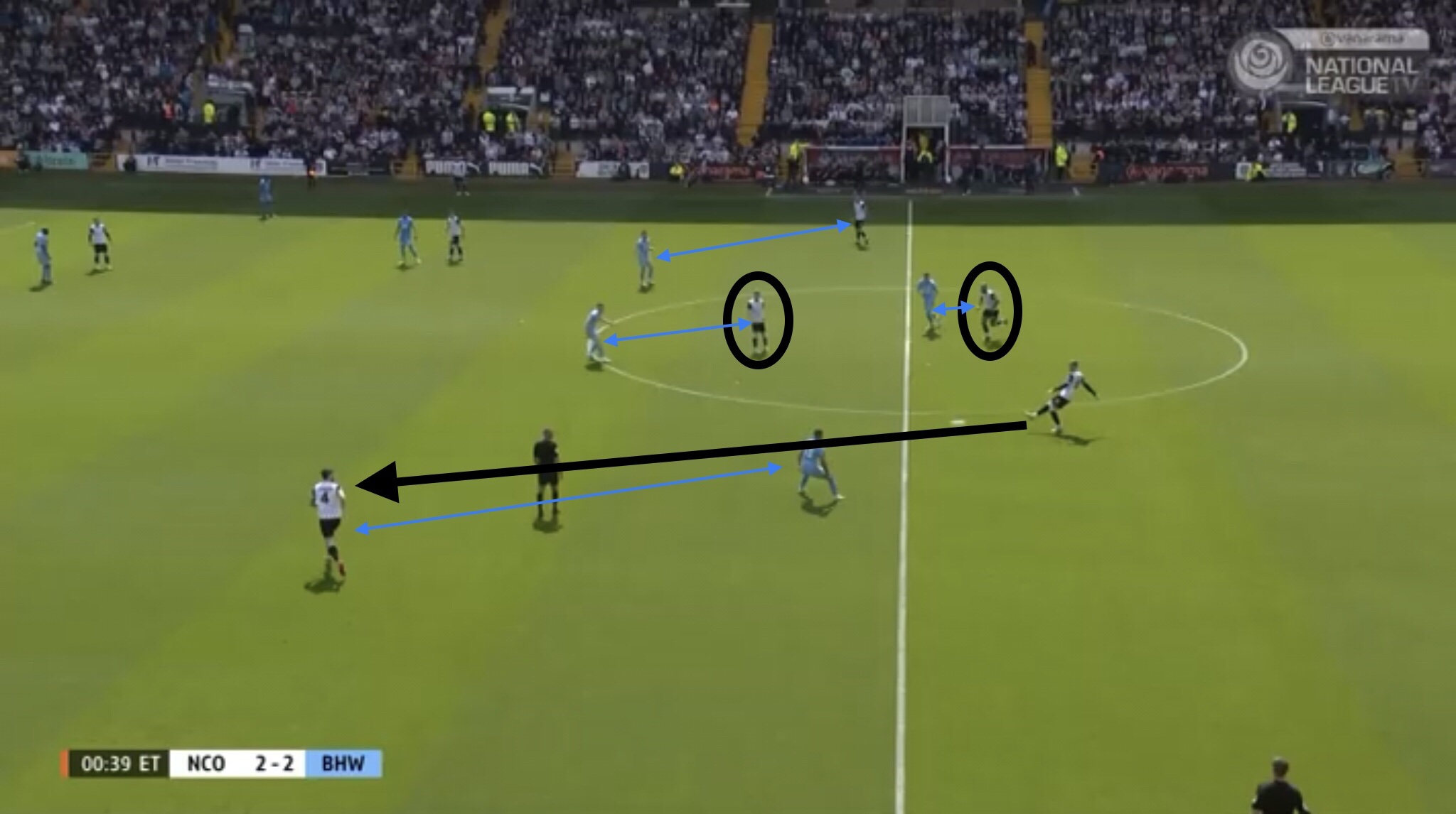Hereâs an example, with Boreham Wood switching the play diagonally towards a striker. They managed to win a free kick on this occasion, presenting them with an opportunity to get the ball into the Notts penalty area.