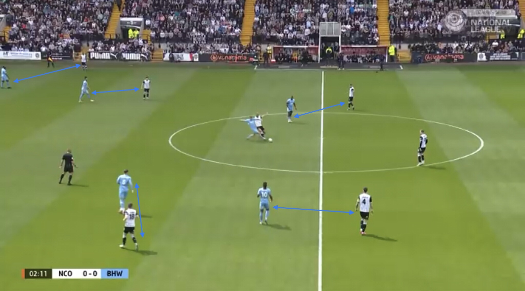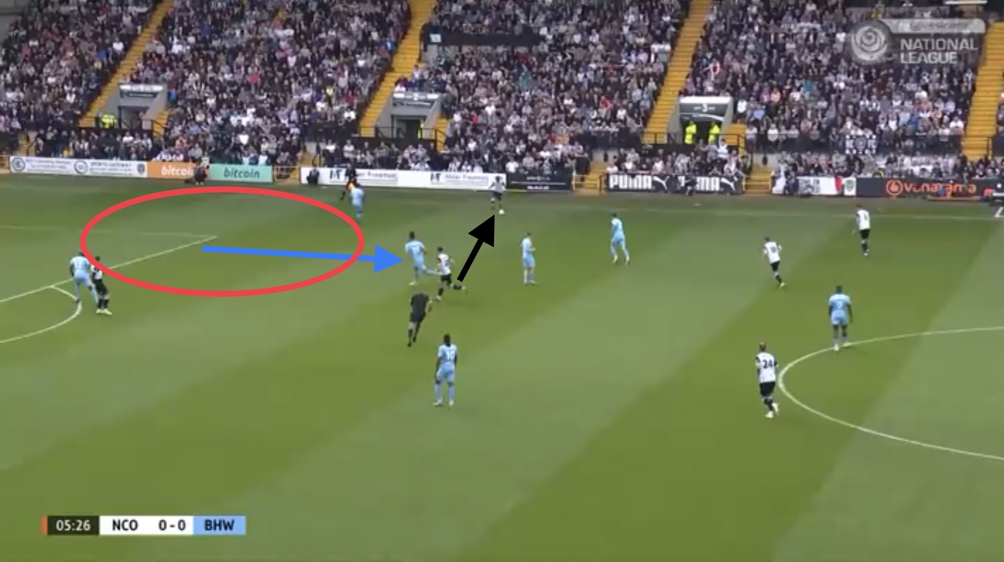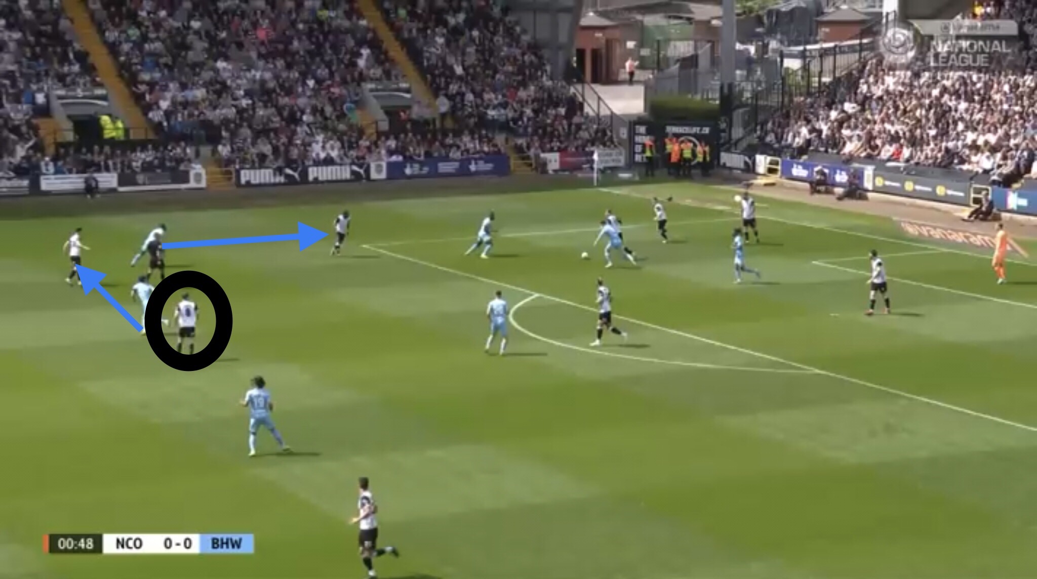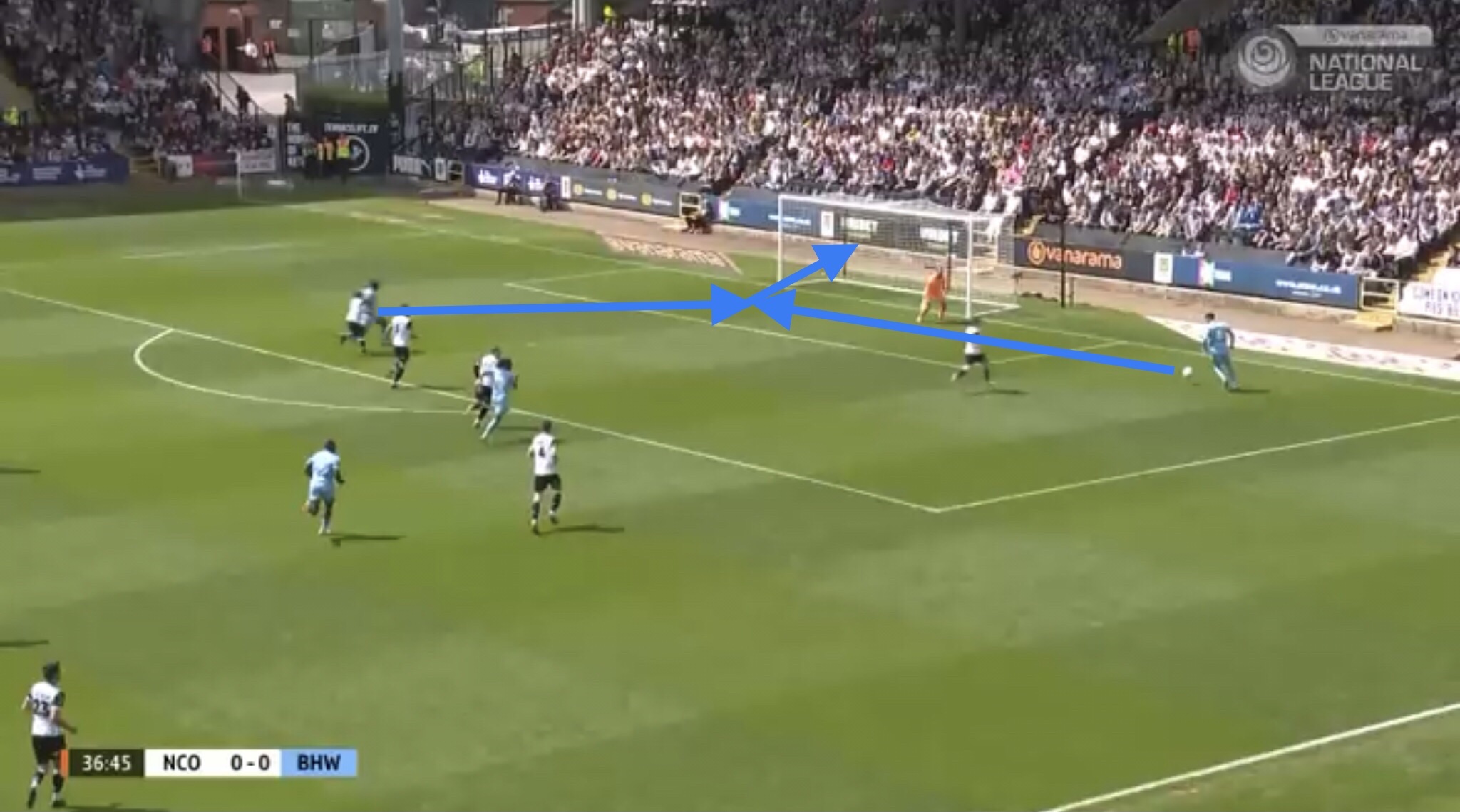 Hereâs an example, with Boreham Wood switching the play diagonally towards a striker. They managed to win a free kick on this occasion, presenting them with an opportunity to get the ball into the Notts penalty area.