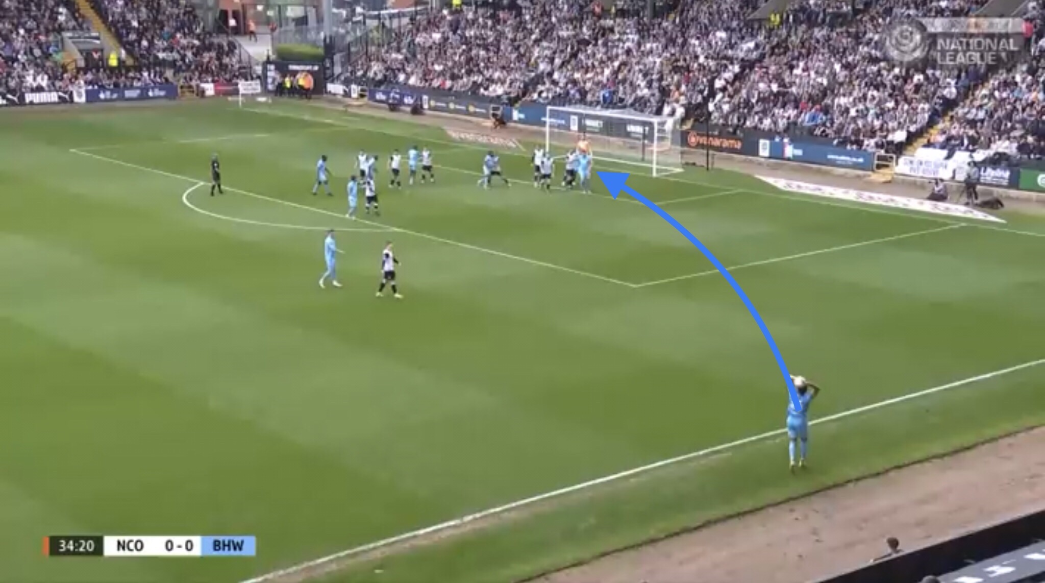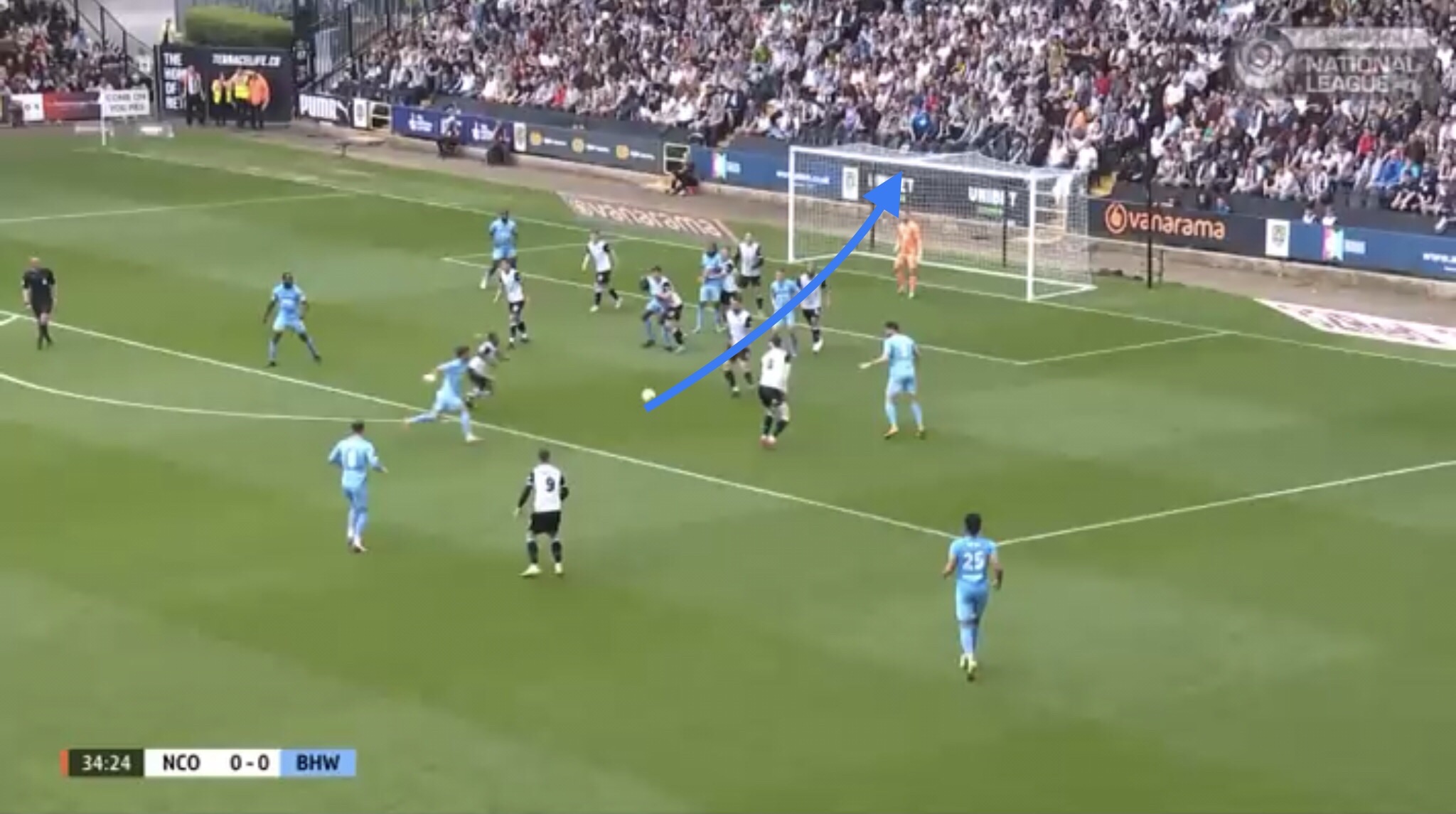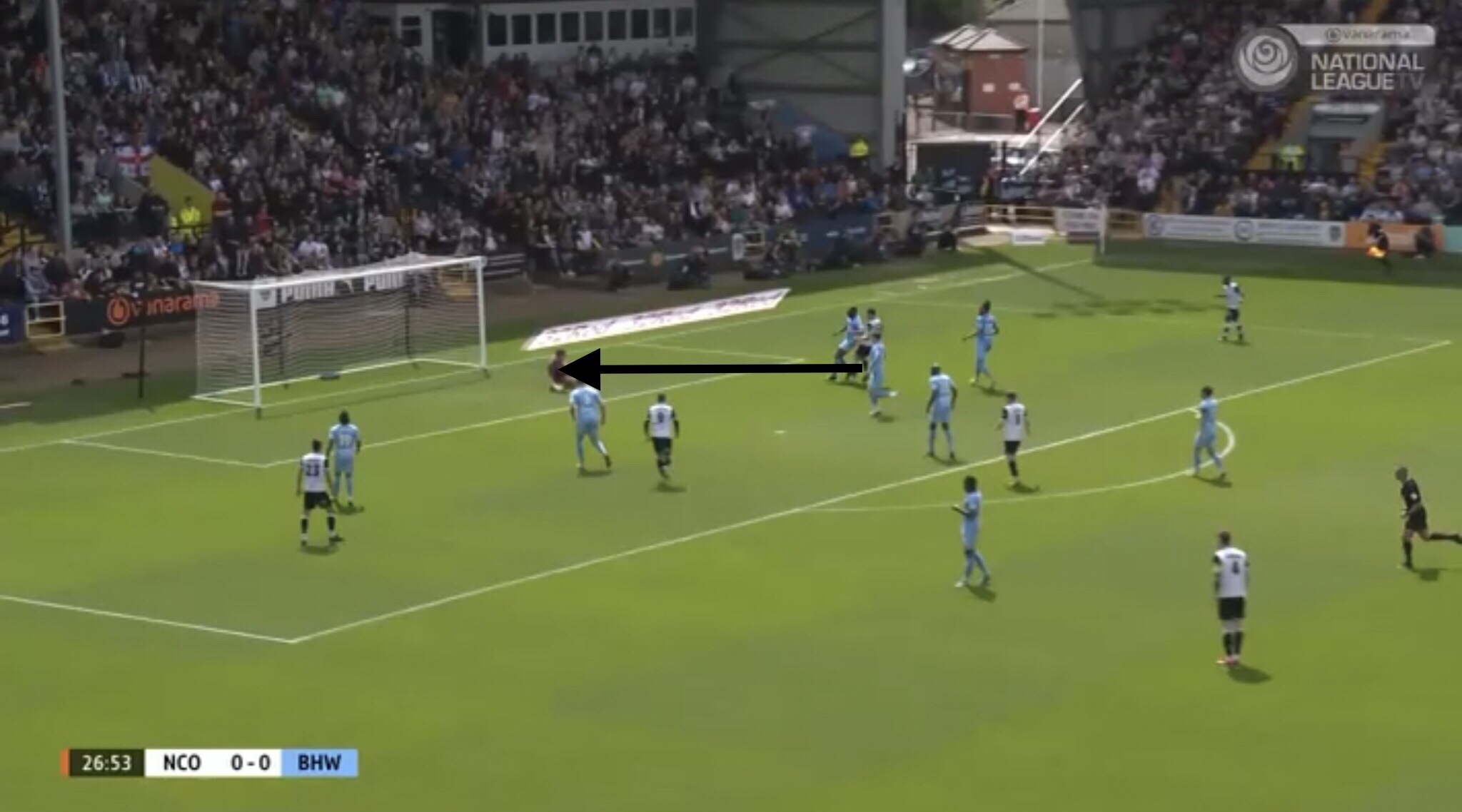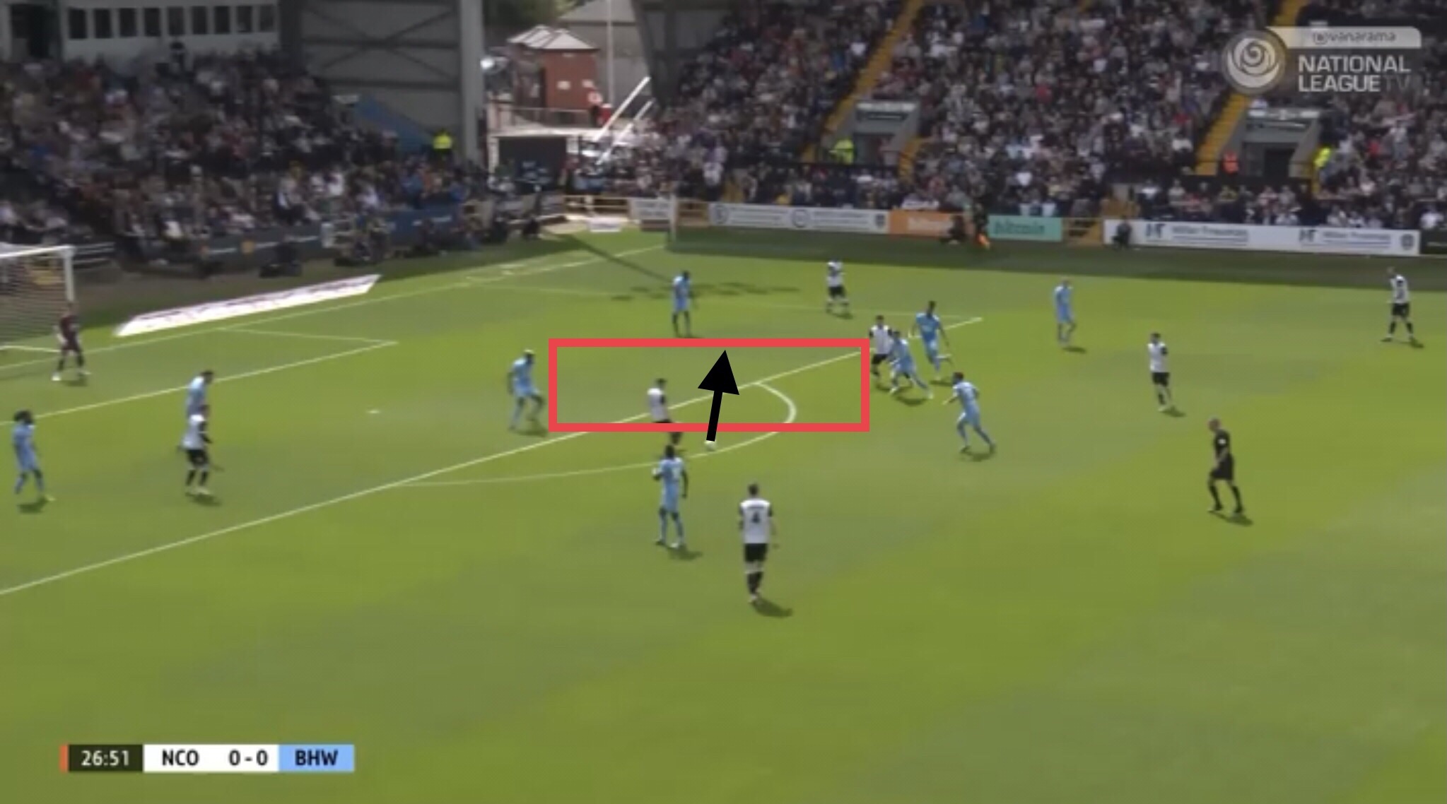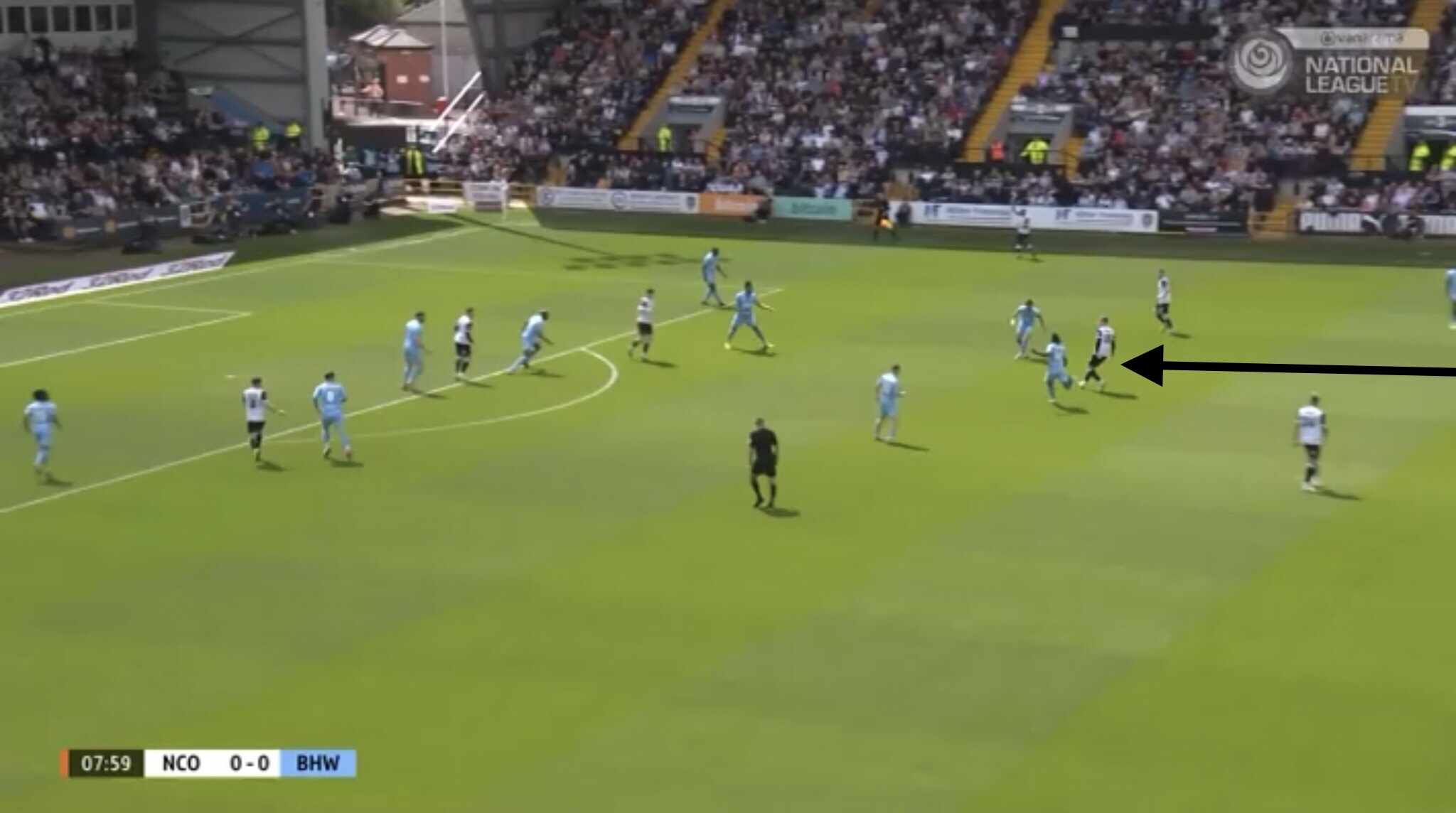 Hereâs an example, with Boreham Wood switching the play diagonally towards a striker. They managed to win a free kick on this occasion, presenting them with an opportunity to get the ball into the Notts penalty area.