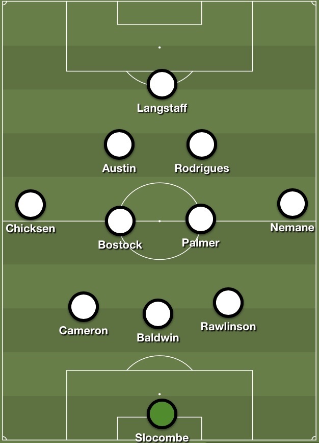 Notts went with a 3-4-2-1 formation. Sam Slocombe was between the sticks, behind a back three of Connell Rawlinson, Aden Baldwin and Kyle Cameron. Aaron Nemane and Adam Chicksen were the wing backs, whilst Matt Palmer and John Bostock were the two central midfielders. RĂşben Rodrigues and Sam Austin played just behind striker Macaulay Langstaff.