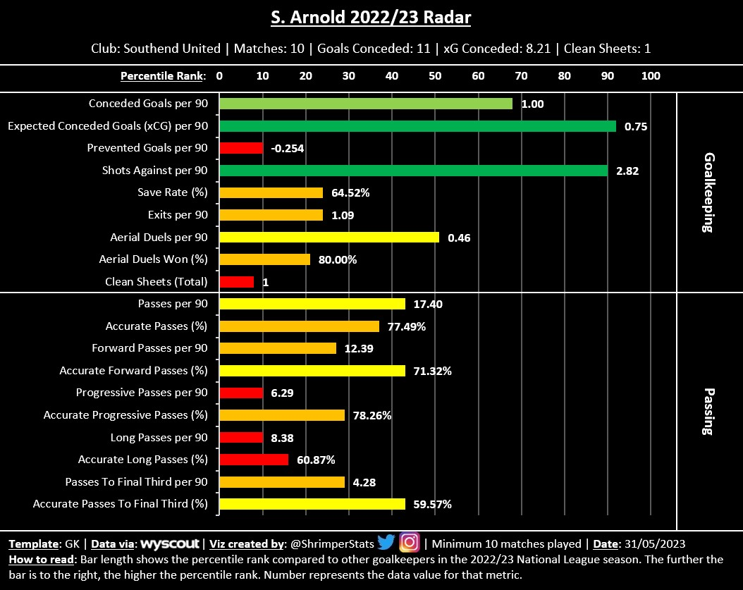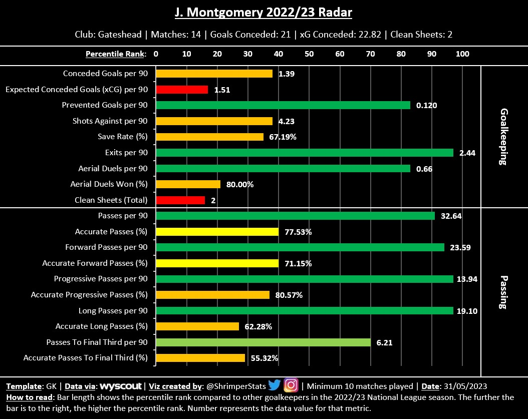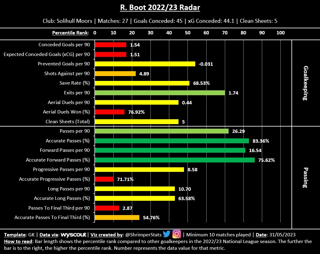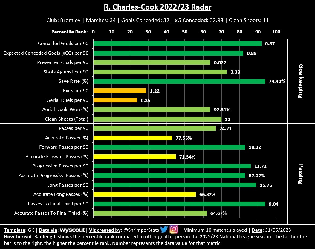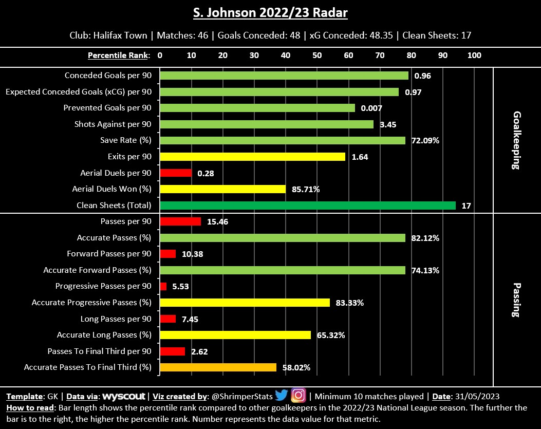 The only weakness that shows up in the data is his box presence. Justham doesn’t seem to leave his line (Exits) too often compared to other National League goalkeepers, and also attempts and wins fewer than average aerial duels. As I mentioned earlier, you can’t scout a player just based on statistics so it may be a non-issue, however, I think it’s something worth keeping in mind.