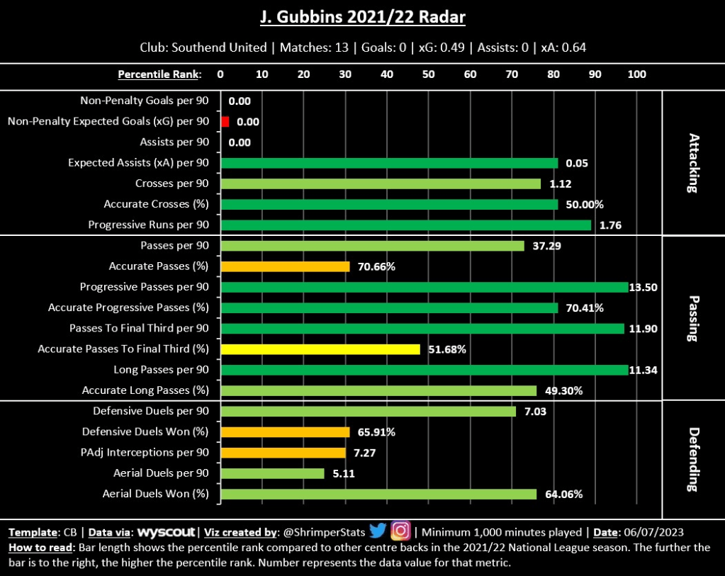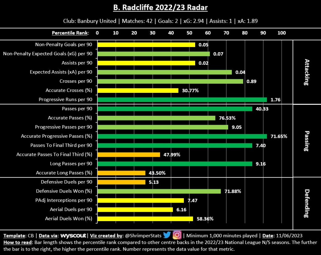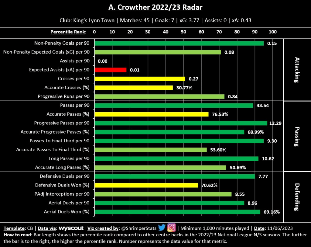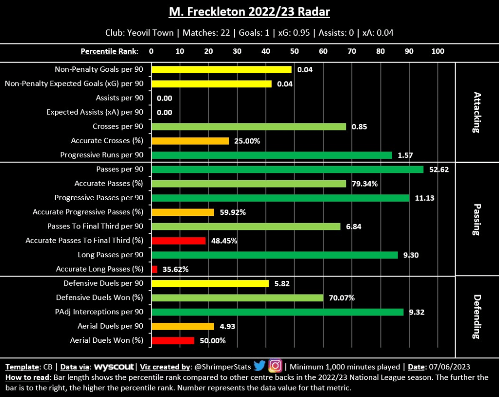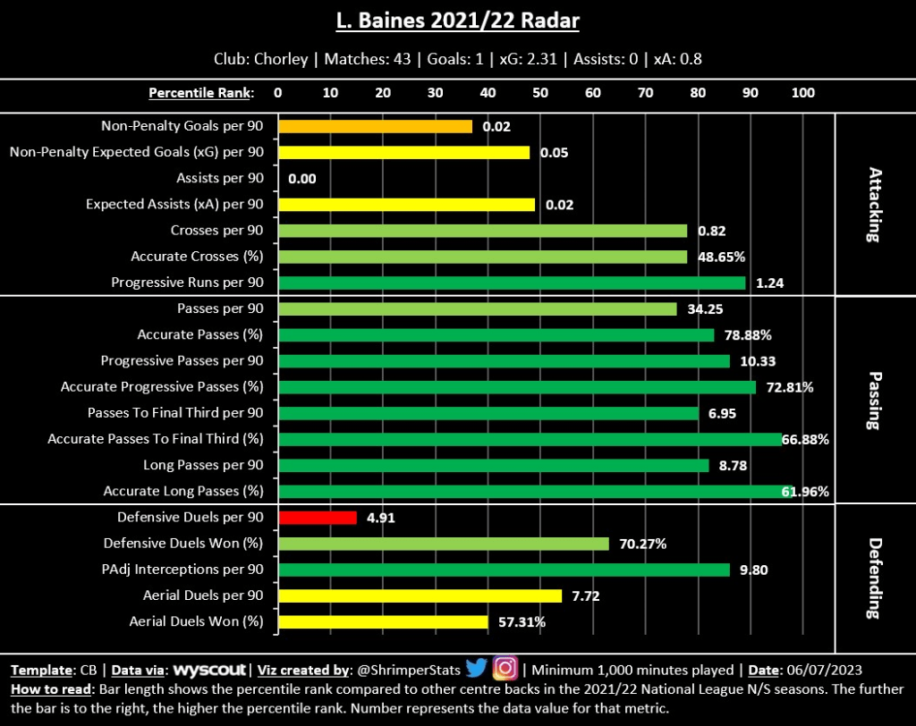 When we look at Baines’ radar chart from the 2021/22 season when he was at Chorley it’s a very different picture. He excels at passing, carrying the ball forwards and at crossing. Of course we have to consider the league that he was playing in, and the National League North isn’t obviously the same standard as the National League, but his role was different too.
