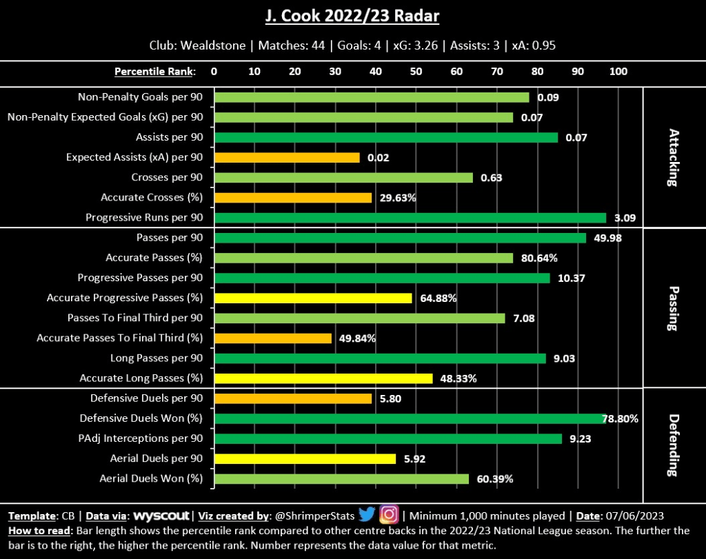 Jack Cook will turn 30-years-old in September. However as I mentioned earlier, I don’t think this is an issue considering we’d be looking for a back up option to Kensdale. However he is under contract at Wealdstone where he is club captain, so this one may be unrealistic. Regardless, Cook is very comfortable in possession, to the point where he is able to play either in the middle of the back three or to the right. Wealdstone are a side who place a high emphasis on building play from defence, and Cook has the ability to fit this system very well. As well as possessing very good ability on the ball, he’s also physical enough so that he can effectively play at the heart of the defence.