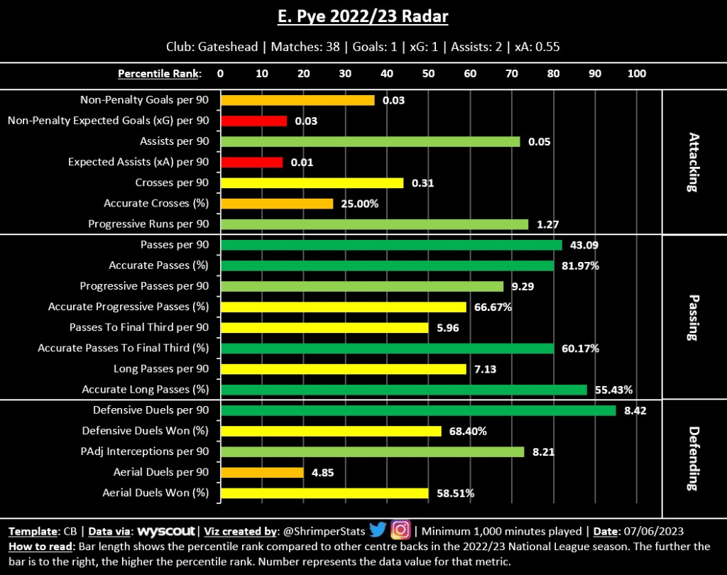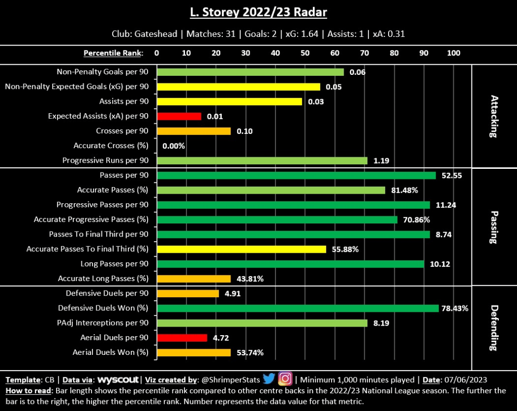 Louis Storey will turn 30-years-old in October and is under contract at Gateshead. As mentioned earlier, Gateshead are a side who like to control possession, and Storey also has the ability to carry the ball forwards from the heart of the defence very well. Although he’s a physical player he doesn’t seem to be particularly effective at challenging for aerial duels. I also think that he could play on either side of the back three as well, although he’s naturally right-footed.