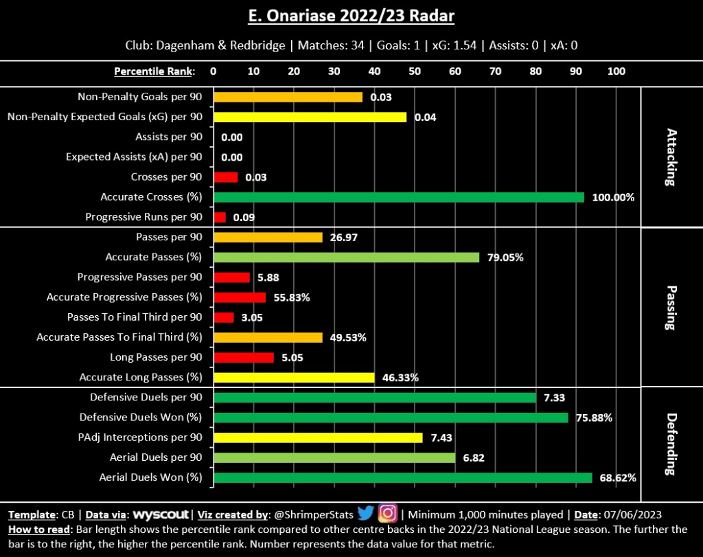 Emmanuel Onariase will turn 27-years-old in October and has been made available for transfer at Dagenham & Redbridge. Whilst he doesn’t look quite as good in possession as the other options, he is a strong defender who is effective at challenging for ground or aerial duels. If we are looking for a back up option I think he would be a good fit, and he is just entering his prime.