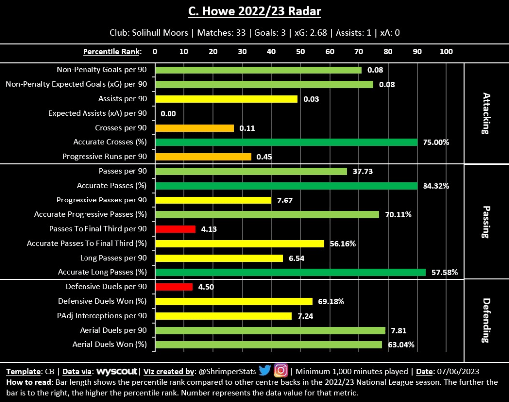 Callum Howe is under contract at Solihull Moors and turned 29-years-old in April. He is Solihull’s captain so a transfer seems unlikely, but he again fits the profile of being strong enough to win aerial duels whilst also being able to help his side progress play from defence. Solihull again are a side who like to play out from the back if they can.
