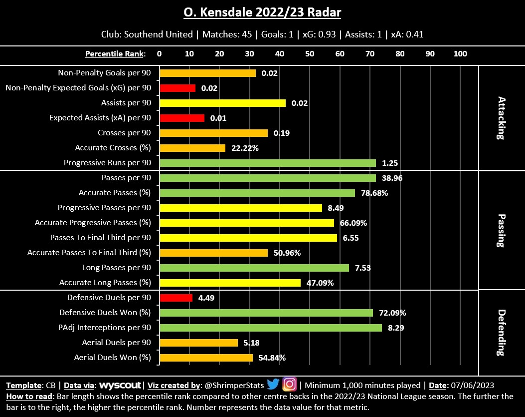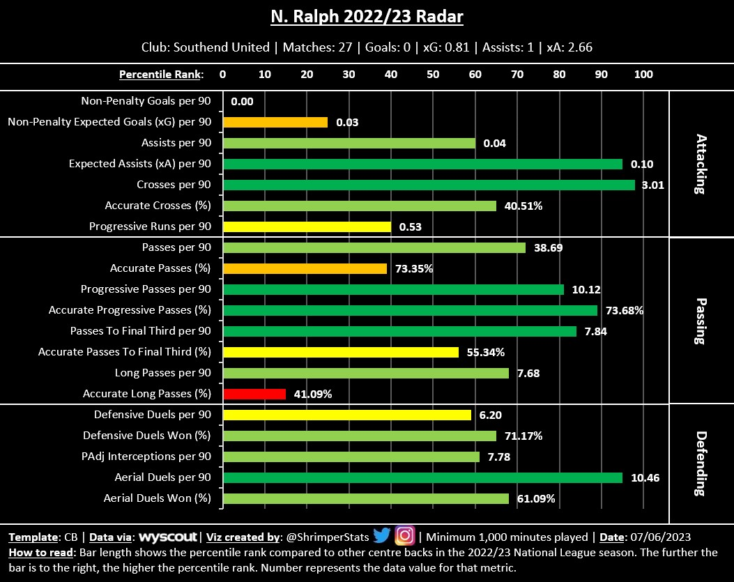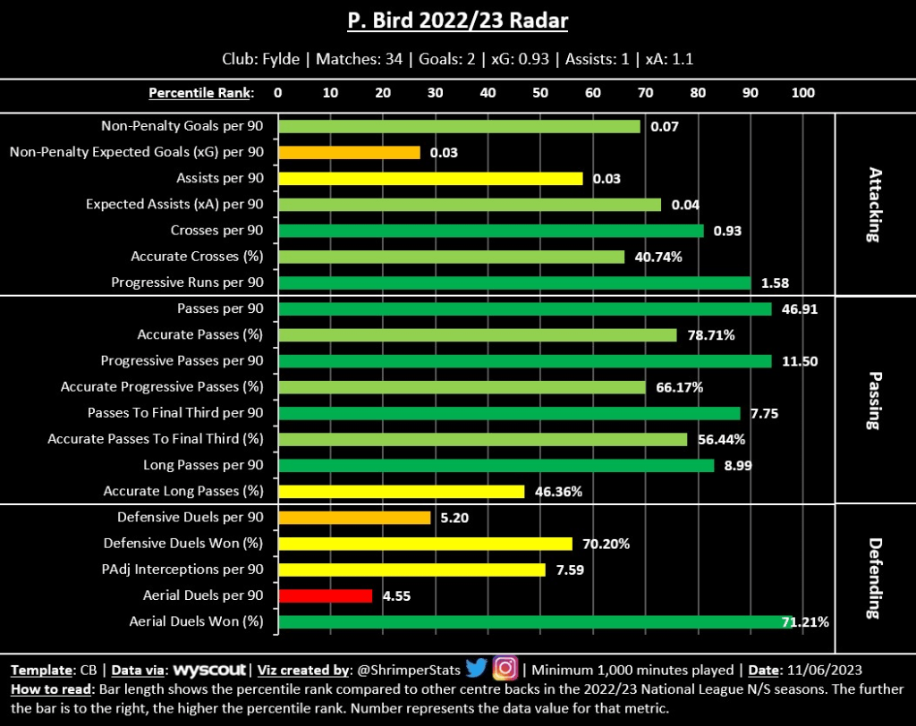 My #1 choice for the left-sided centre back role is Fylde’s Pierce Bird. Bird turned 24-years-old in April and is under contract at Fylde. He is tall, strong, left-footed, and fairly quick for his size. The below stats show how strong he is in possession, and he can carry the ball forwards and cross the ball into the opponent’s penalty area when supporting the attack. His mobility also allows him to defend the wide areas which is important when playing on the outside of a back three. A left-sided centre back in his age range coming into the club would also signify good squad planning considering Ralph is now 30-years-old.