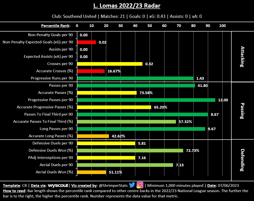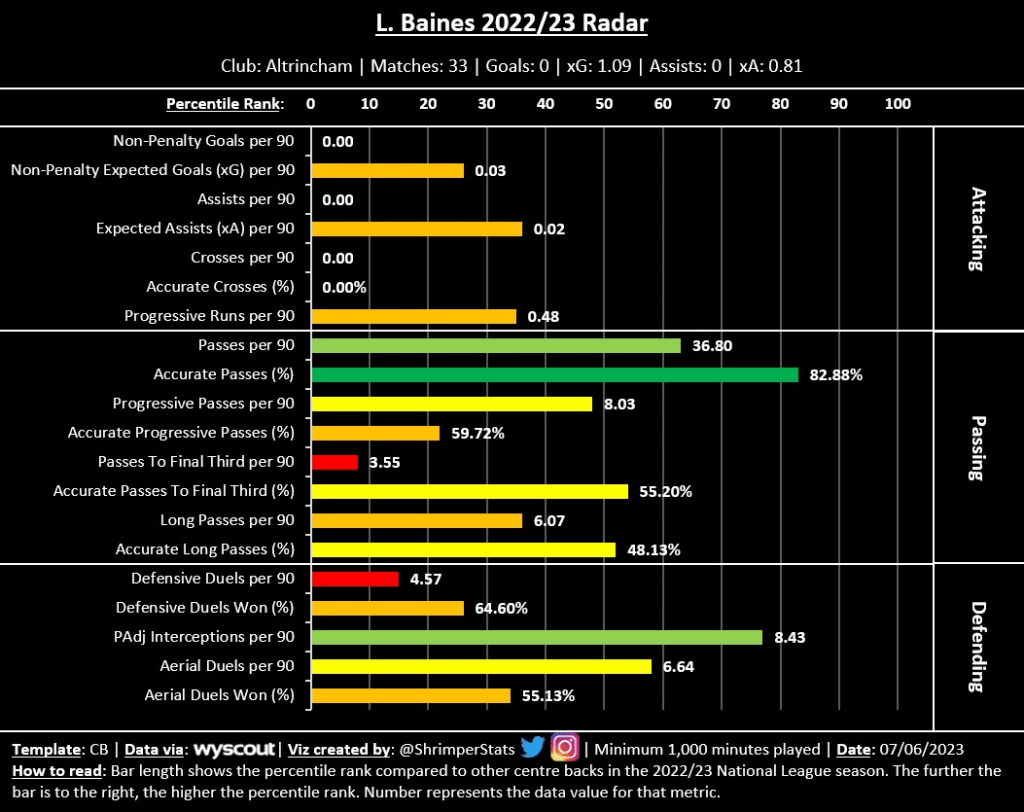 Lewis Baines is under contract at Altrincham and will turn 25-years-old in October. We can see from the below stats that he’s good at making lots of passes, but beyond that nothing really stands out. The stats don’t really do him justice, however this is largely because he plays as part of a centre back pairing for Altrincham. When we consider the requirements for playing in a centre back partnership compared to on either side of a back three – they are very different. For instance there’s more emphasis on carrying the ball forwards or crossing the ball into the box when you’re in a back three, as you have more freedom to get forwards.