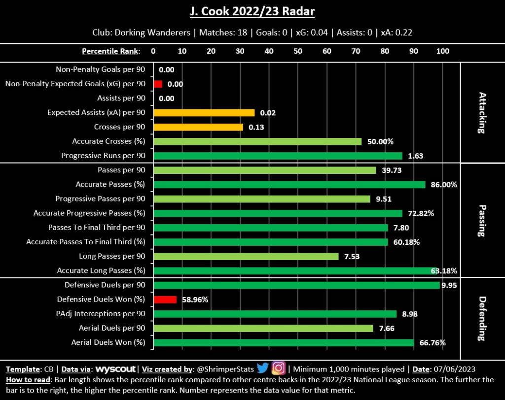 Currently under contract at Dorking Wanderers and turning 24-years-old at the end of July, Joe Cook would be a good fit to play on the right side of our back three. He fits the profile of being comfortable in possession whilst also being a physical presence, and is able to defend the wide areas due to his mobility. Whilst naturally being right-footed, Cook also featured on the left side of Dorking’s back three last season – so could provide more cover there as well.