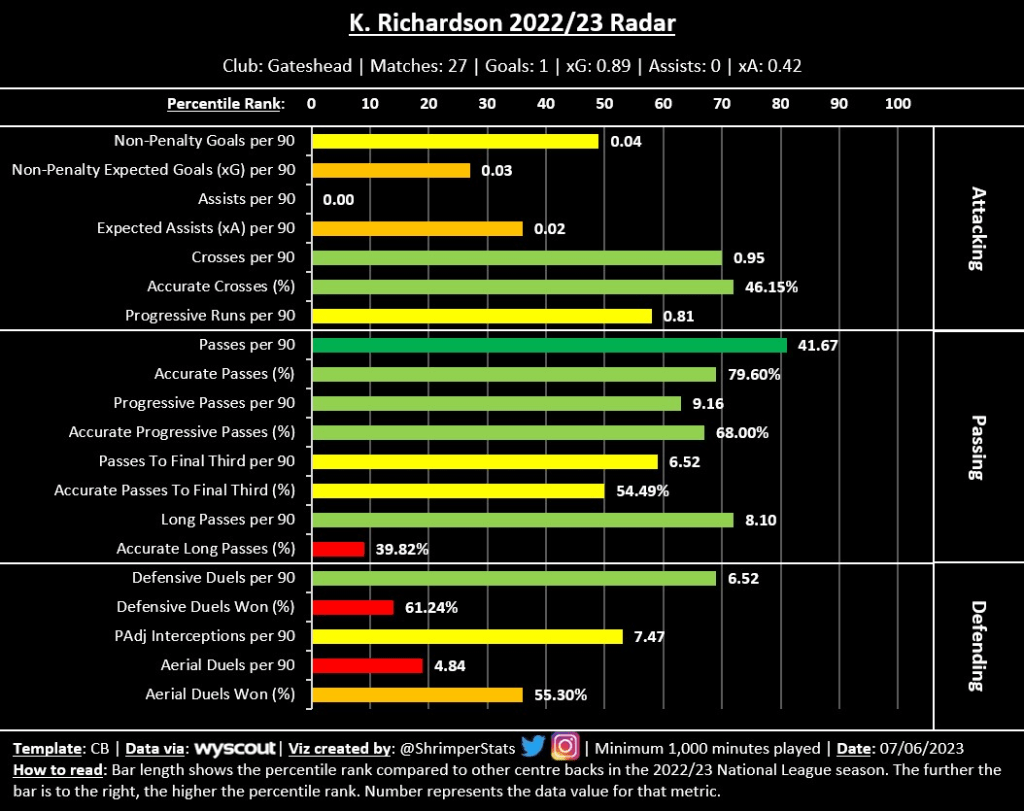 Kenton Richardson turned 24-years-old at the end of June, and had an option for a further year on his contract activated by Gateshead earlier this summer. A similar profile to Cook, Richardson also has the ability to deliver crosses into the opponent’s penalty area when higher up the pitch supporting the attack. Gateshead also place a lot of emphasis on controlling possession, so Richardson has to be comfortable on the ball to fit into this system. I also think that Richardson could play on the left of the back three.
