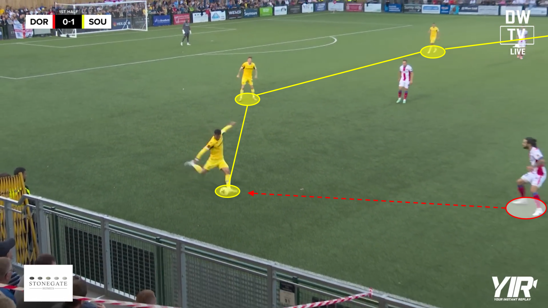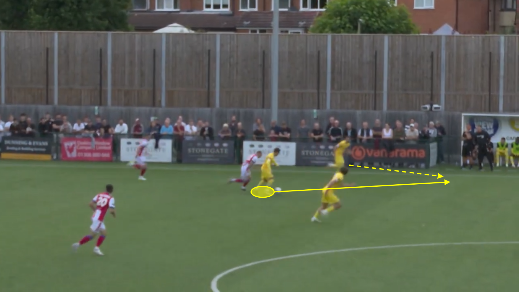 On this occasion we used Harry Cardwell’s speed to play over Dorking’s press. However the ball didn’t quite fall for him quickly enough and his shot was saved. Although in this instance he didn’t score, Cardwell is a very important player to enable us to play over a man-to-man press. By nature, these structures are difficult to play against as all of your players are within close proximity of opponents and they don’t have much time on the ball. Cardwell gives us the option to not only go long for him to challenge for aerial duels where he can win flick-ons, but he’s also quick enough to be able to run onto through passes like in this example.