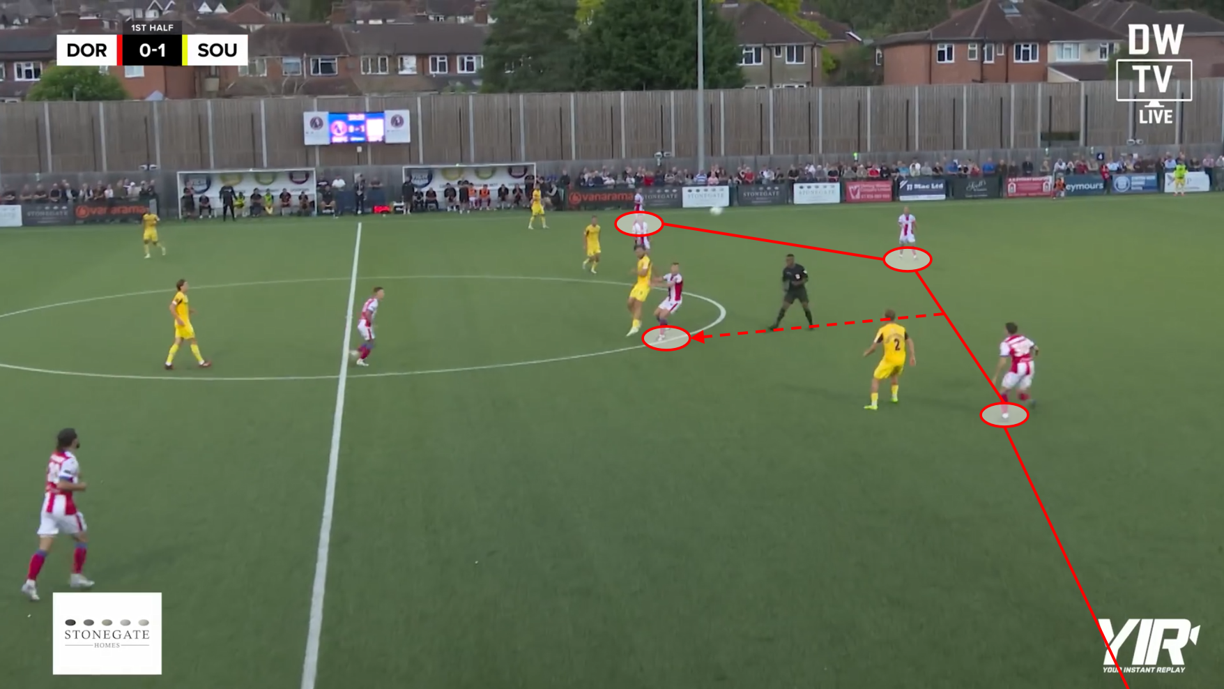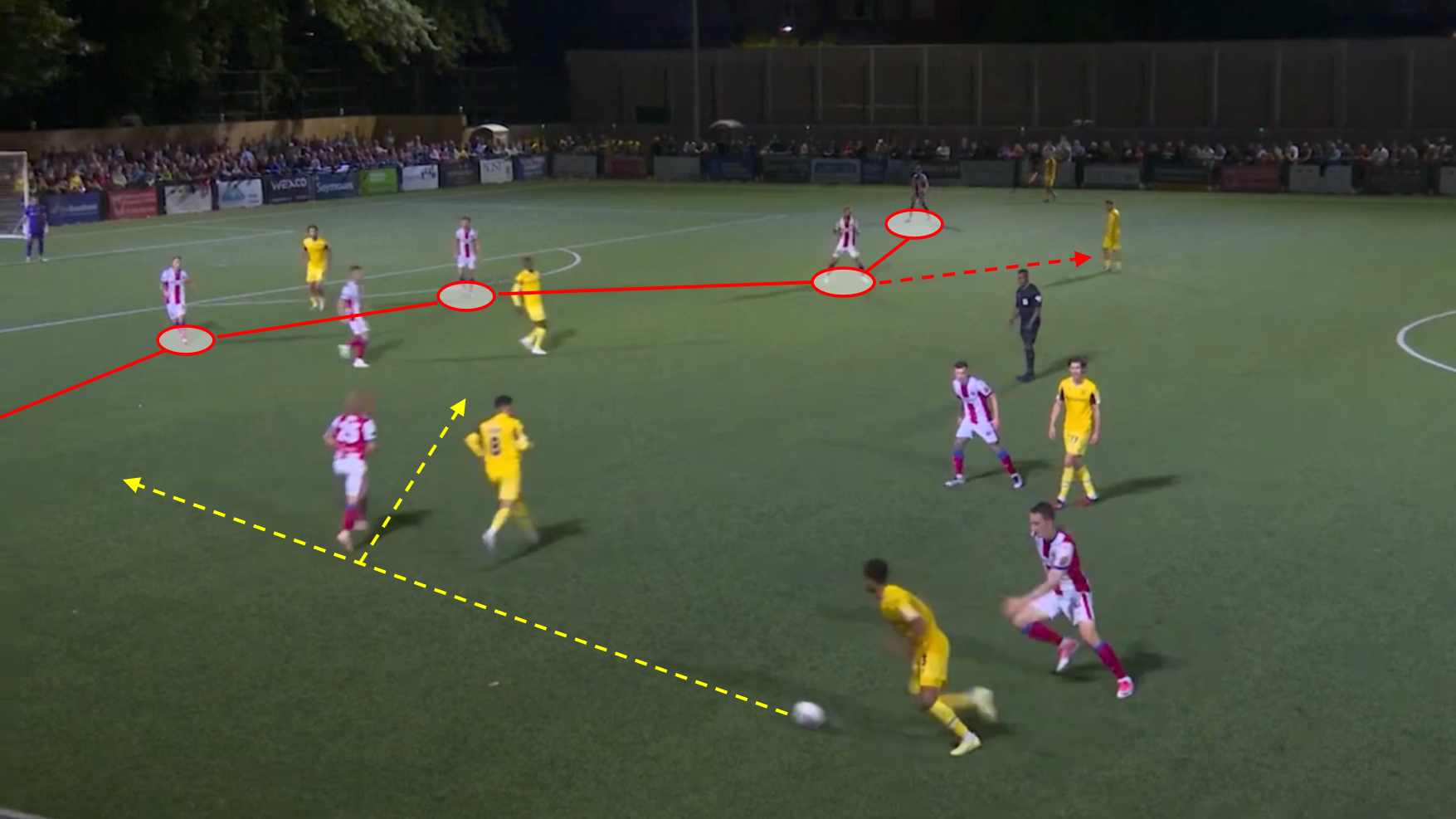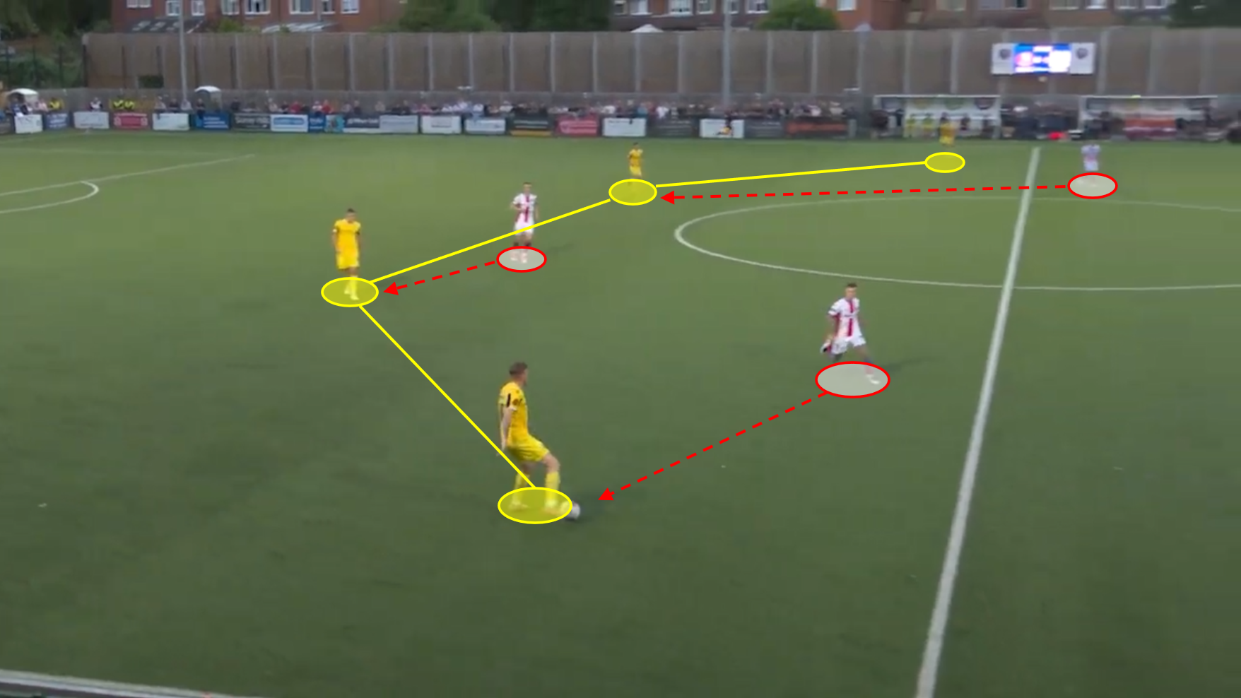 Here’s a clearer example of one of our midfielders dropping deeper to form a back four during build-up. Here, Husin has dropped into the right back area, but this attracts one of Dorking’s midfielders to the press, whilst their two strikers are marking Taylor and Kensdale. Ralph is the spare man on the opposite side of the pitch, out of picture.