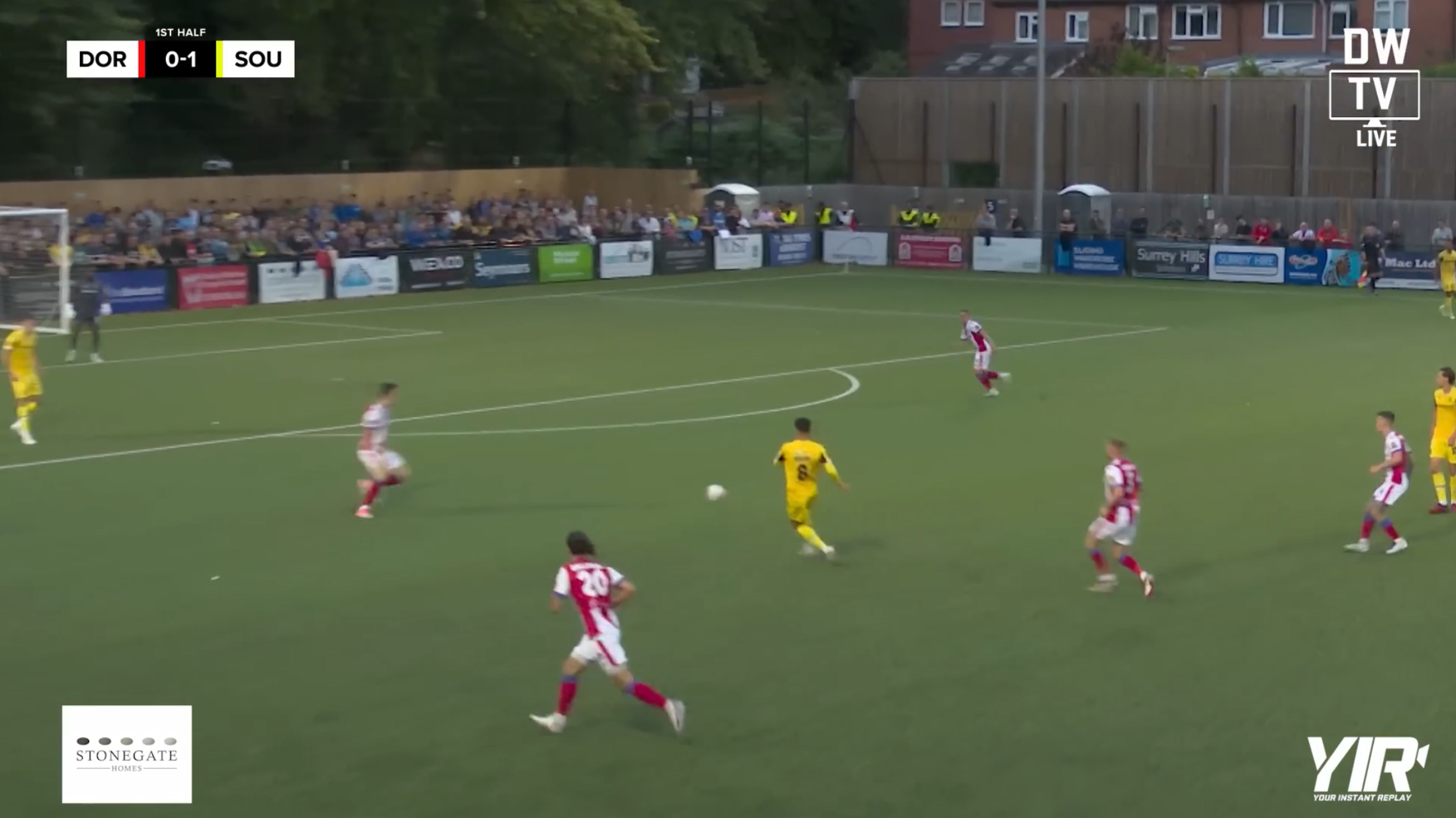 This is how we scored our goal. Early in the match with Dorking losing possession high up the pitch on their right, they had committed their right wing back to the attack, and he was now attempting to counter-press, leaving Jack Bridge in space. We managed to play through Dorking’s counter-press rather than go long, and found Mooney. He turned his marker (one of Dorking’s centre backs) and passed to Bridge, who was in space. Bridge then carried the ball forwards and crossed to Cardwell to score, who had a bit more space as Dorking had one less centre back defending.
