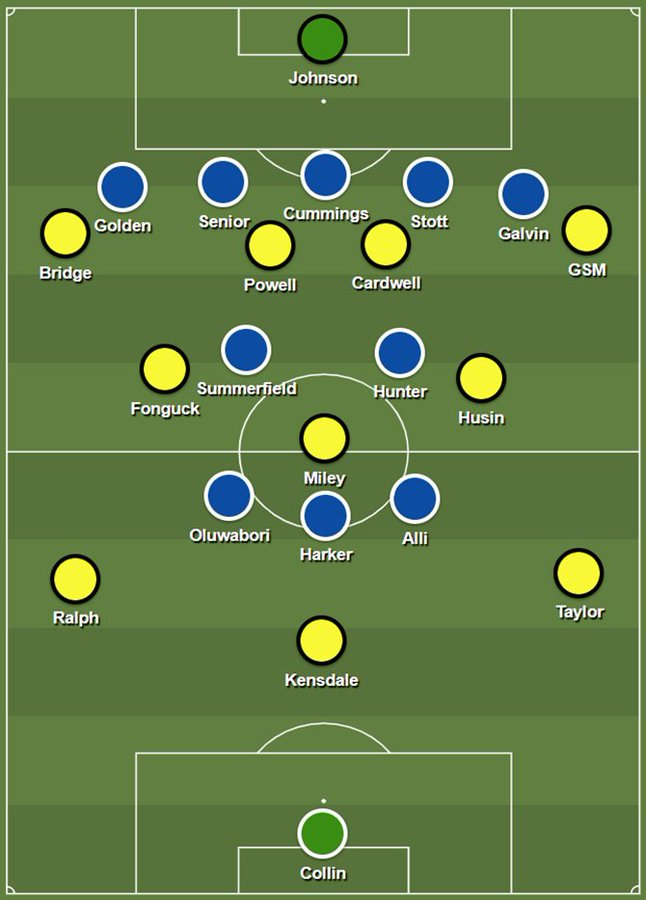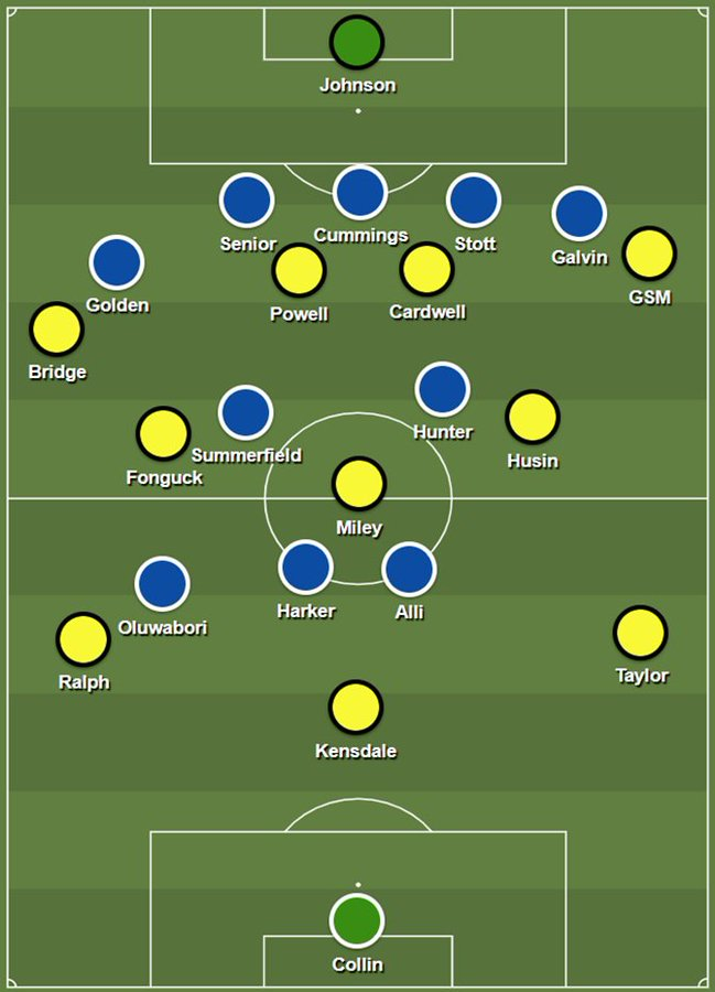 Halifax used a 5-2-3 defensive block; Southend’s wing backs and strikers pinned Halifax into a back five, Halifax went man-to-man in midfield, and pressed Southend’s back three and #6 (Cav Miley) with their narrow front three. The below image illustrates how it looked on paper.