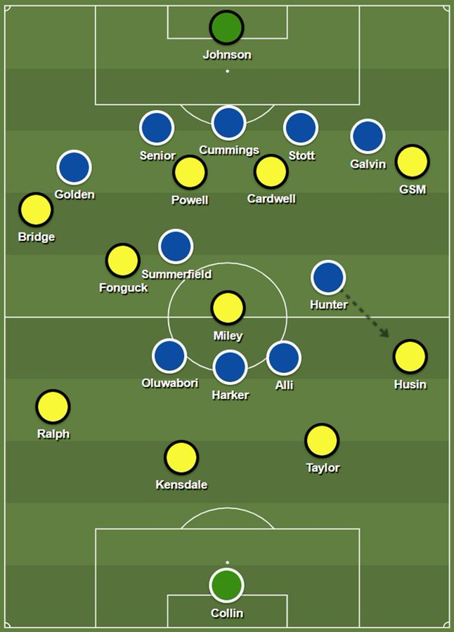 In the first half, Southend built play from defence in our usual 3-4-3 Diamond shape. However there was a slight tweak to the system as Callum Powell pushed up alongside Harry Cardwell as a second striker. This pinned Halifax’s three centre backs.