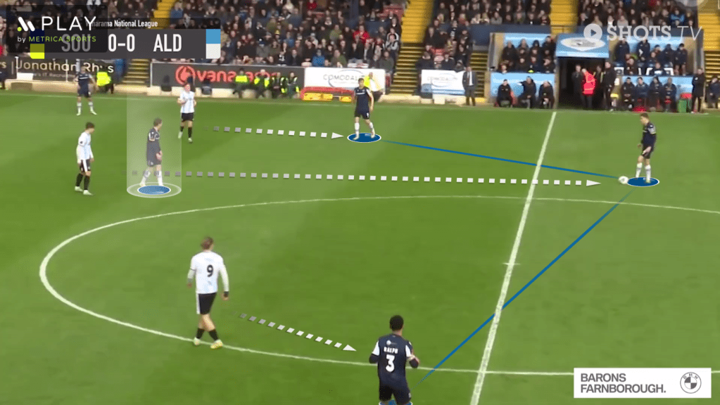 Because we struggled to beat Aldershot’s press consistently from the start of the match, it would not only have reduced our confidence in our build-up method, but also increased Aldershot’s belief in their press. Because they were able to consistently turn possession over and create dangerous opportunities in transition, their front-three would have continued to press with aggression, as opposed to drop intensity if their belief in the press reduced, if it wasn’t working from the start of the match. Aldershot’s central-midfielders would also drop deeper if they didn’t have the confidence in their high press, as the ball would likely be coming towards their defence soon. This therefore would mean that Aldershot would sit deeper, making it easier for us to exert control on the match.