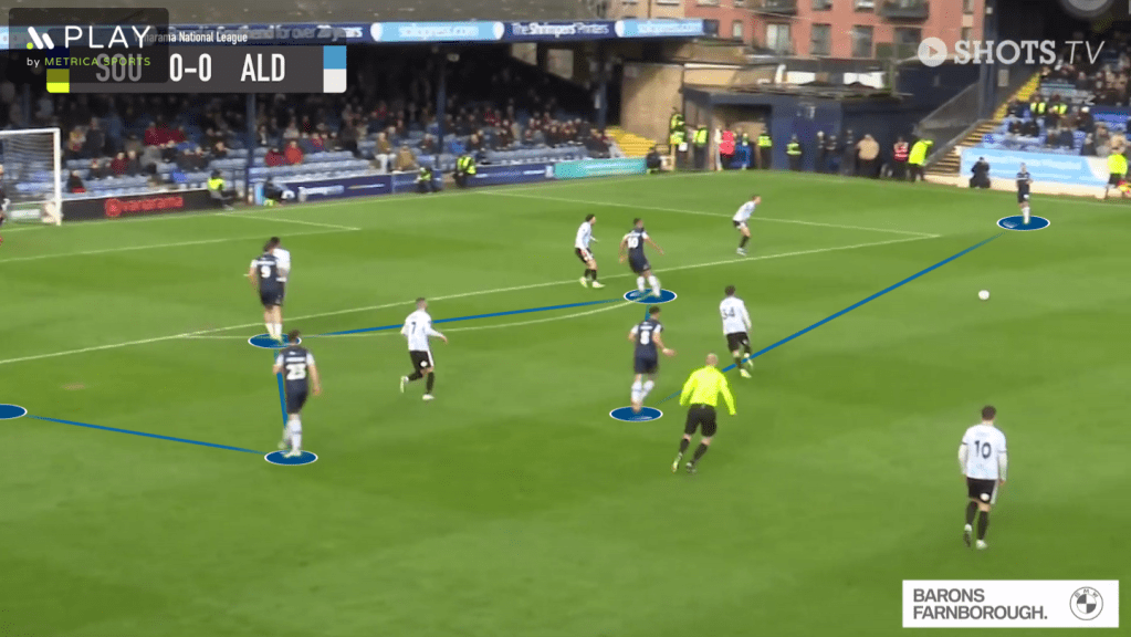 This 3-1-6 shape is how we usually set-up once we’re into the final-third, and it usually works just fine. However, every opponent is different, and different tactics may work differently depending on your opponent’s strengths and weaknesses. Aldershot were able to exploit the openness of our 3-1-6 shape consistently.