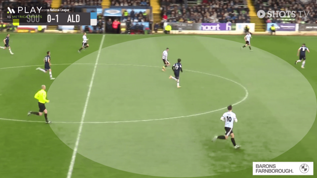 The issue with this structure is that it isolates our single #6 Miley in the middle of the pitch, and gives him a lot of space to defend (as we can see below) against an Aldershot side who leave three central players (their #10 and two #9’s) high up the pitch when they are defending deep in their own half.
