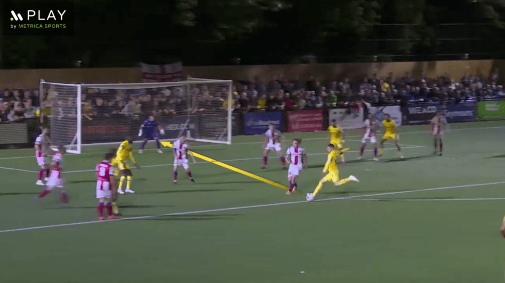 Scott-Morriss is also unable to consistently create separation from his marker to the same level as Bridge is, which makes it more difficult for him to create clear crossing opportunities. One way to create this separation is through dribbling against your marker, but Scott-Morriss attempts just 1.95 1v1 dribbles per 90 minutes, whereas Bridge attempts 5.61 1v1 dribbles per 90. Additionally, Scott-Morriss doesn’t have the quick burst of pace that may counter a lack of dribbling ability, as another way to create separation.