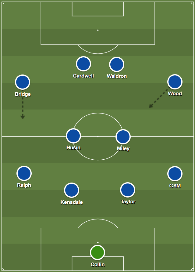 Instead, he’d be able to come off of the bench late-on in a match if we needed to break down an opponent who are sitting deep in a low-block. If against a low-block, our ability to create frequent settled attacks and have subsequent control would be inherent. As a result, Wood would be able to play as the right-sided #8 in our side, as he’d have less defending to do, and we’d have more time to rotate Wood and Scott-Morriss so that he was out on the right-side, with Scott-Morriss inverting.