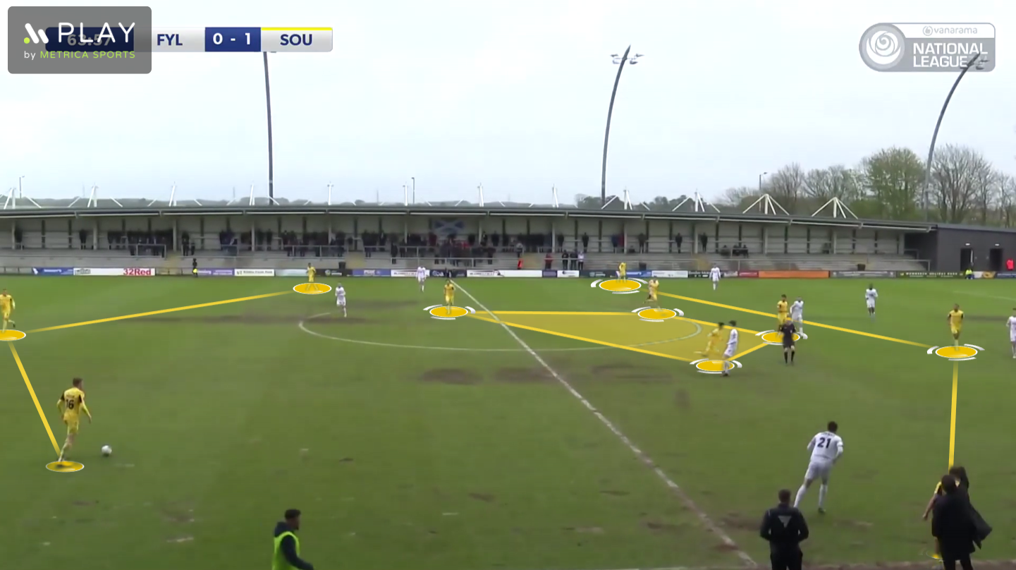 With Fylde sat in their low/mid-block, we were able to build play in the first-phase higher up the pitch, rather than on the edge of our penalty area. Additionally, there was a lot of space when Fylde were passive in the press. Morton would often drop deeper from his left-sided #8 position into this space, which acted as the catalyst for a couple of positional rotations.