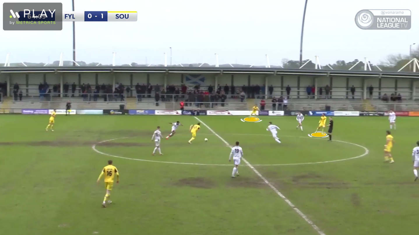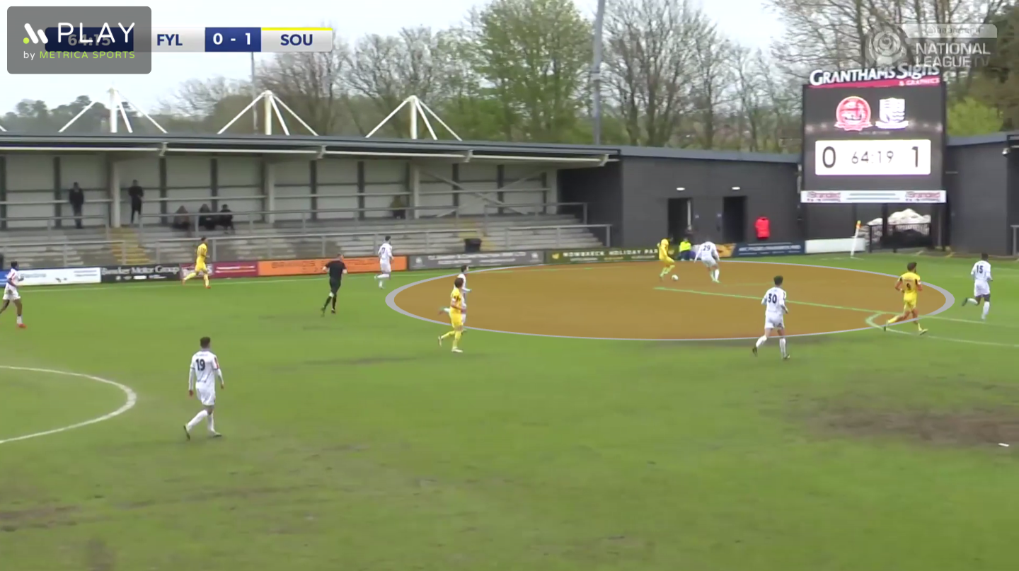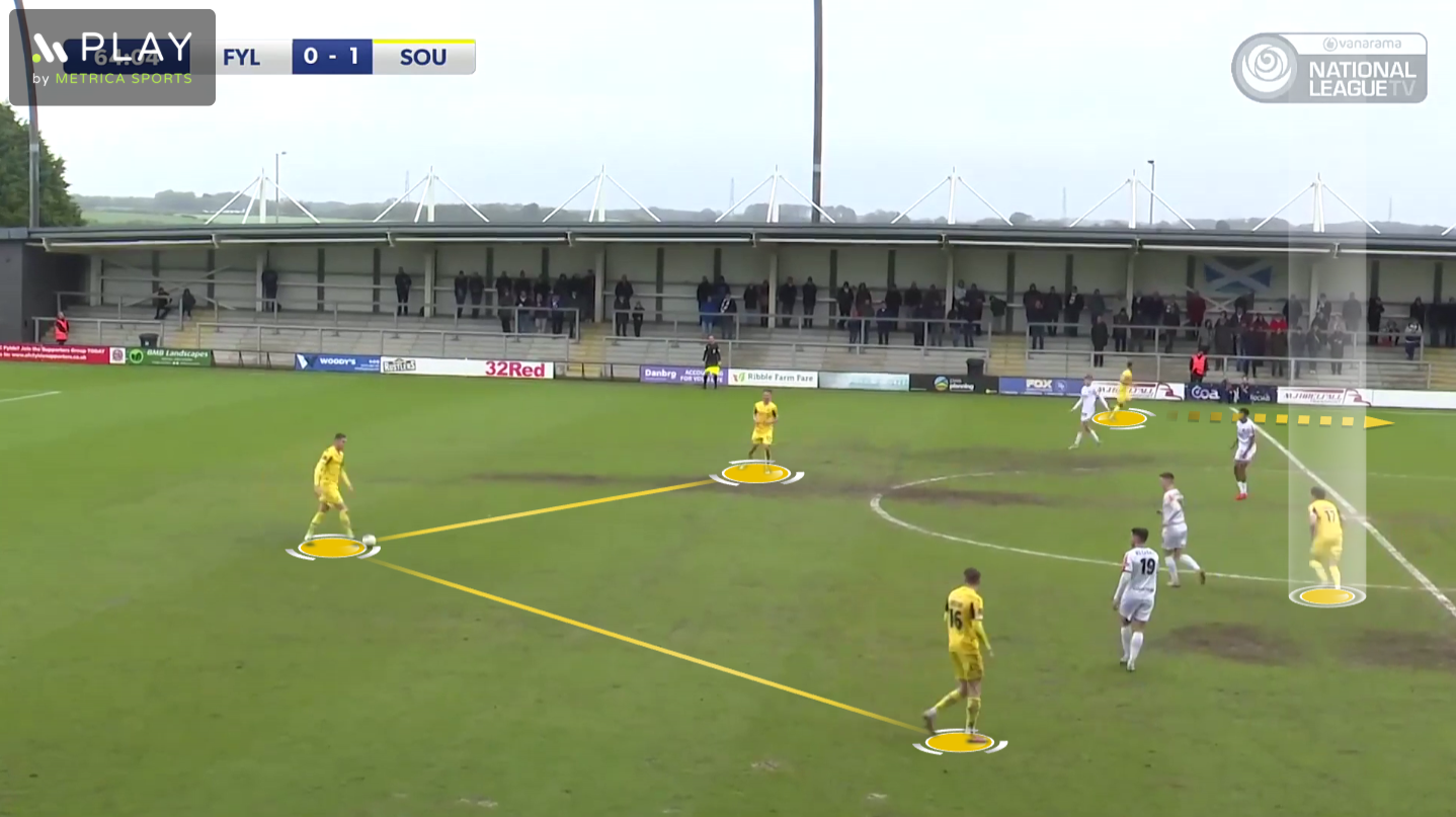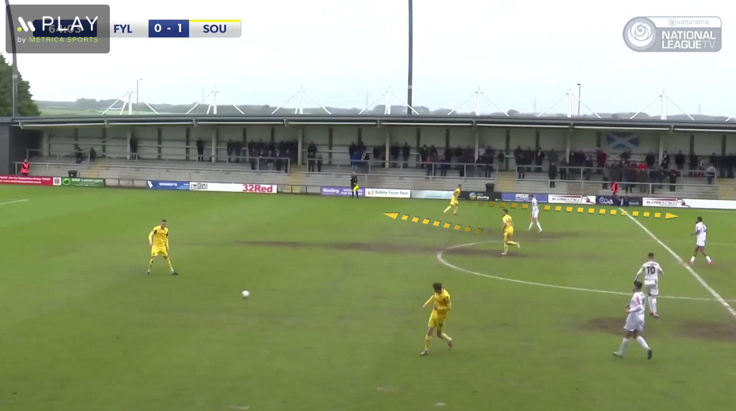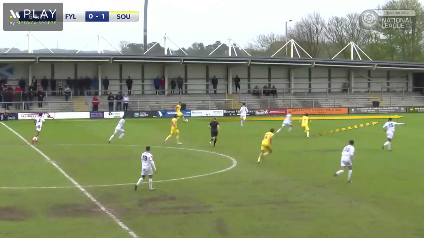 On this occasion we moved the ball out to Ralph, which dragged Fylde’s right-back out of position to press him. This created a large gap between Fylde’s right-back and right-sided centre-back in their back-four, and Bridge made a forwards run through this space, to get on the end of a through pass from Ralph.