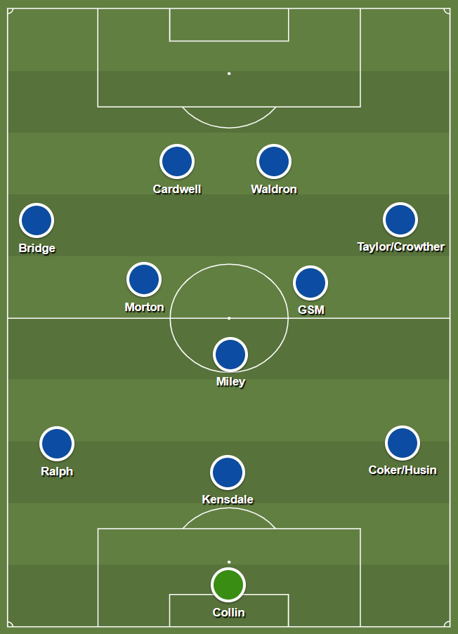 Coker or Noor Husin (our right-sided #8 options) could drop into the first line because they can play a high pass volume, but then we’d miss their ability in the final-third if we progressed the ball forwards before they could join the attack. Taylor or Adam Crowther (our right-sided centre-back options) aren’t the type of players you’d want holding the width high up on our right-side, at all. Although Scott-Morriss possibly could invert from our right-side, he isn’t as technically secure as Bridge, and it may lead to more turnovers of possession. Additionally, as Taylor or Crowther would be high up the pitch, they wouldn’t be able to help out in the event of these turnovers of possession, as they’d likely be too far away.