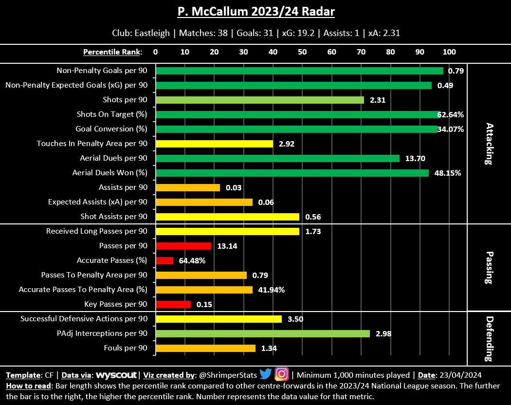 To conclude, Paul McCallum, who will turn 31-years-old in July, is a proven, clinical striker at National League level. His physicality allows his side to play long passes towards him to bypass opposition presses, and aim crosses into the oppositions’ penalty area towards him. He is excellent at creating separation from his marker in the penalty area, to get on the end of high quality chances.