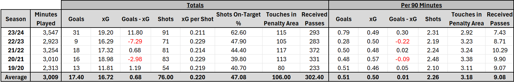 However, over the past five seasons, McCallum has averaged 0.50 xG per 90 minutes, actually scoring at a rate of 0.51 goals per 90. When we consider his availability, where McCallum has averaged just over 3,000 minutes per season in that same timeframe (which is equivalent to just over thirty-three 90 minutes), it’s fairly safe to suggest that he should still be scoring around 20 goals next season – if he continues to stay fit.
