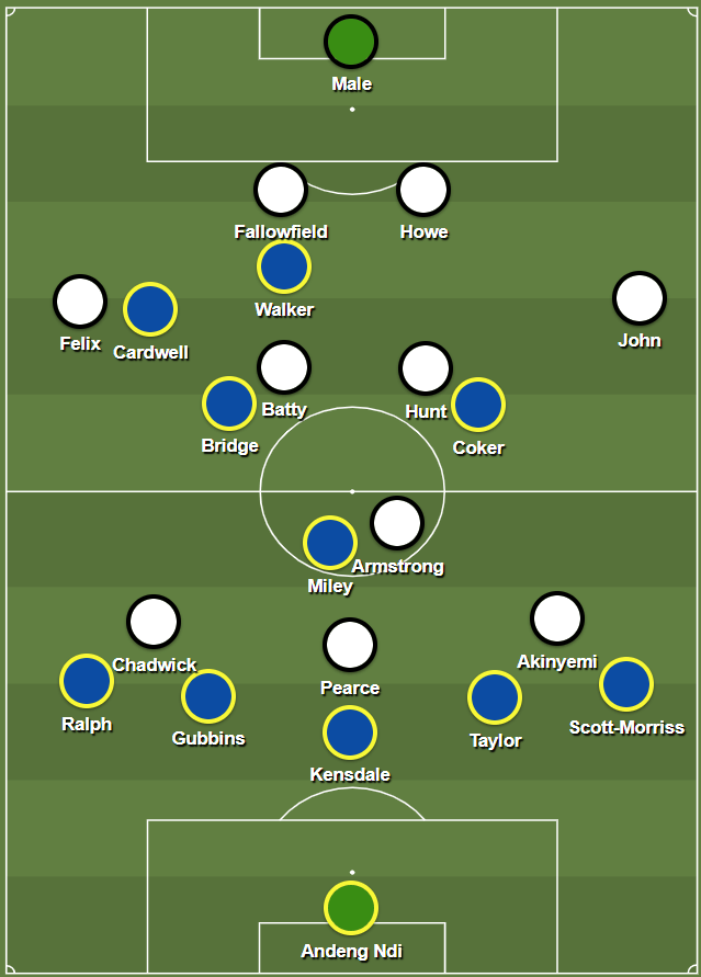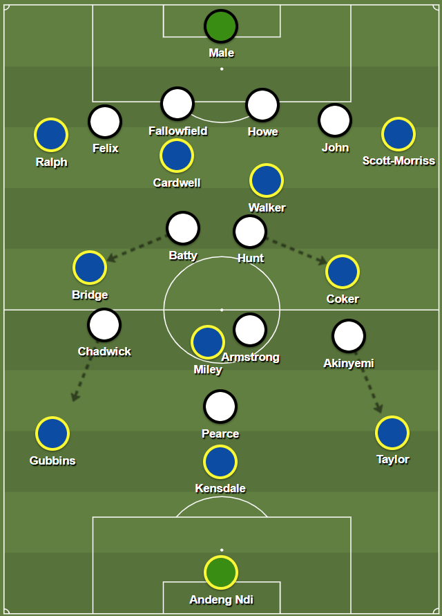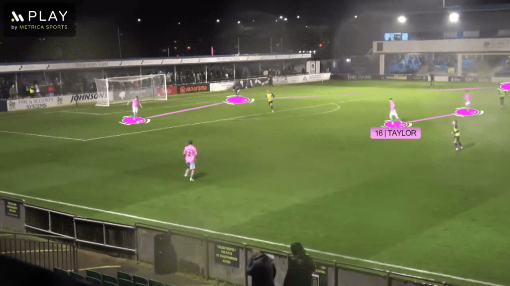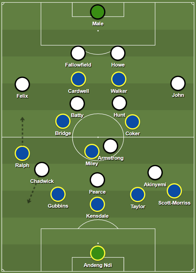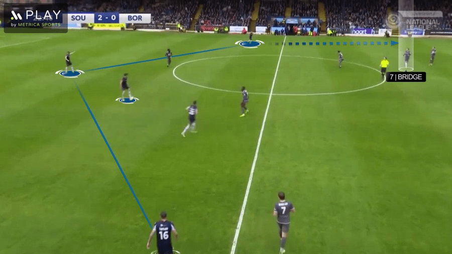Previously, we have seen James Morton drop back to act as the situational left-sided centre-back after Nathan Ralph had pushed forwards, with Jack Bridge inverting into the midfield. However, with Ralph being used at left wing-back, Joe Gubbins playing on the left of the back-three, Bridge being used centrally, and Morton not included from the start, this rotation was not possible.