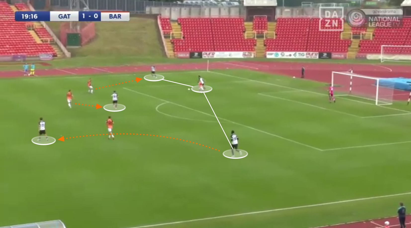 Nevertheless, Barnet still did a pretty good job of forcing Gateshead to ‘go long’ towards their centre-forward, Owen Oseni. This method of ball-progression is riskier than safely progressing through the thirds, as there are more duels that have to be challenged for.