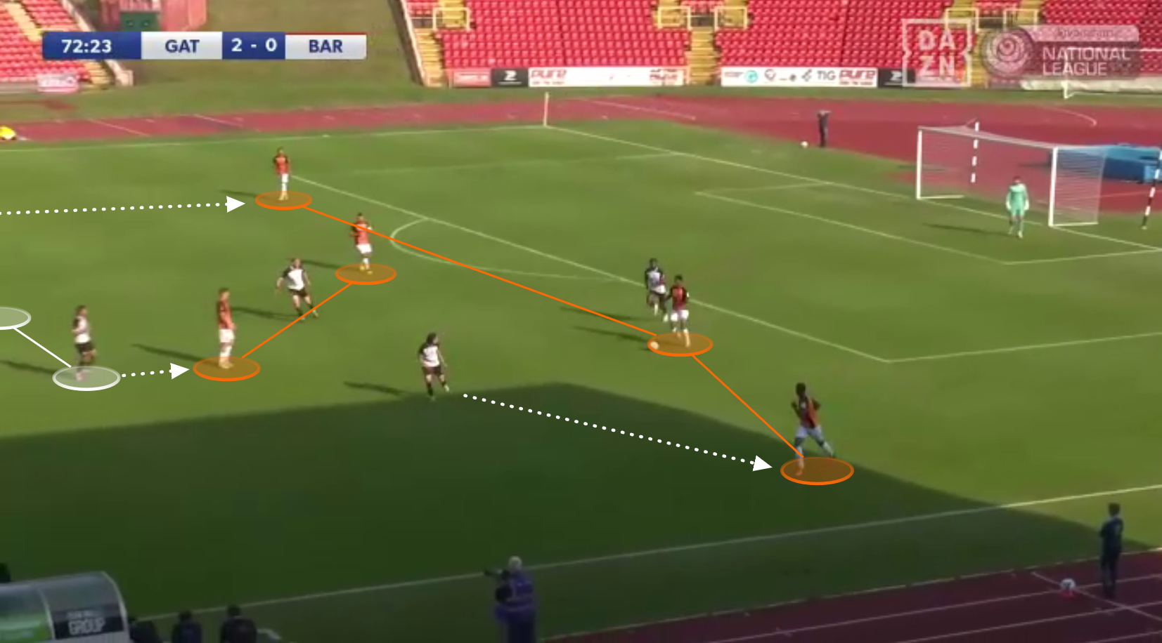 Although this is more advantageous for Barnet, forcing Gateshead to ‘go long’ rather than allowing them to build safely, Gateshead have more than one way of creating danger. After playing over the press towards Oseni, he could either hold play up to bring onrushing Gateshead players into play, or challenge for aerial duels.