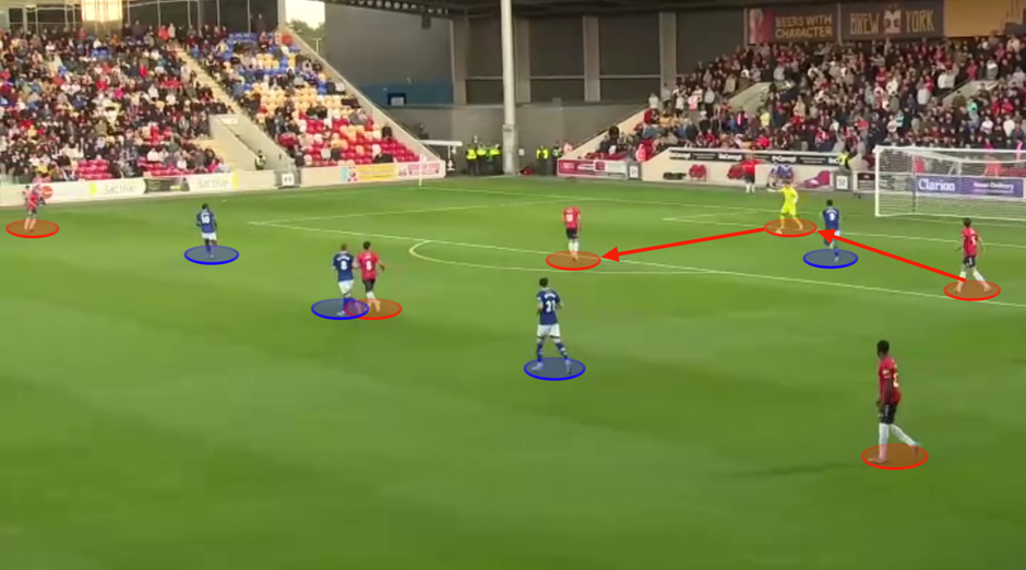 Below, we can see how York again built in a 4-1-5 shape. The front five pinned Rochdale into a back-five, which meant that Allarakhia couldn’t jump to press. Consequently, Rodney had to mark out wide which meant that Mitchell was easily overloaded 2v1. From here, York could find the spare man with ease and progress.