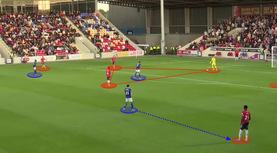This season, McNulty has devised a brand new variation of this 3-2-5 build-up structure. Tobi Adebayo-Rowling now holds the width on the right-side; Tarryn Allarakhia holds the width on the left-side; Connor McBride tucks inside into the right half-space; Devante Rodney is in the left half-space; and Kairo Mitchell is the centre-forward.