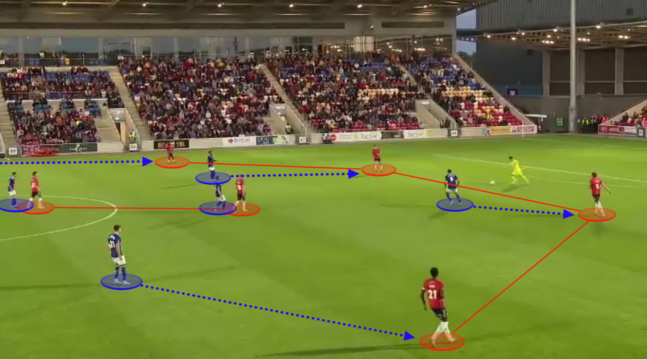In an away match at Aldershot Town, we can see how a run into the half-space was pivotal in allowing Rochdale to create an overload out wide, before enabling them to cross the ball into the penalty area which led to their second goal (below).