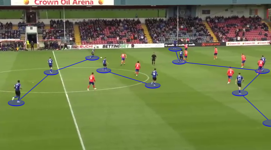 This 3-2-5 shape (below) allows Rochdale to have players in close proximity during the build-up, as well as having sufficient numbers in the last line. Five players are positioned deep, and five players are high. The close proximity of the deeper players – who are all comfortable on the ball – allows them to combine quickly, retain possession, and exert control on matches. Then, in the final-third, the front-five can overload opposition back-fours with ease. Additionally, because they have players spread evenly across all five vertical zones, these players can easily combine and interchange positions.