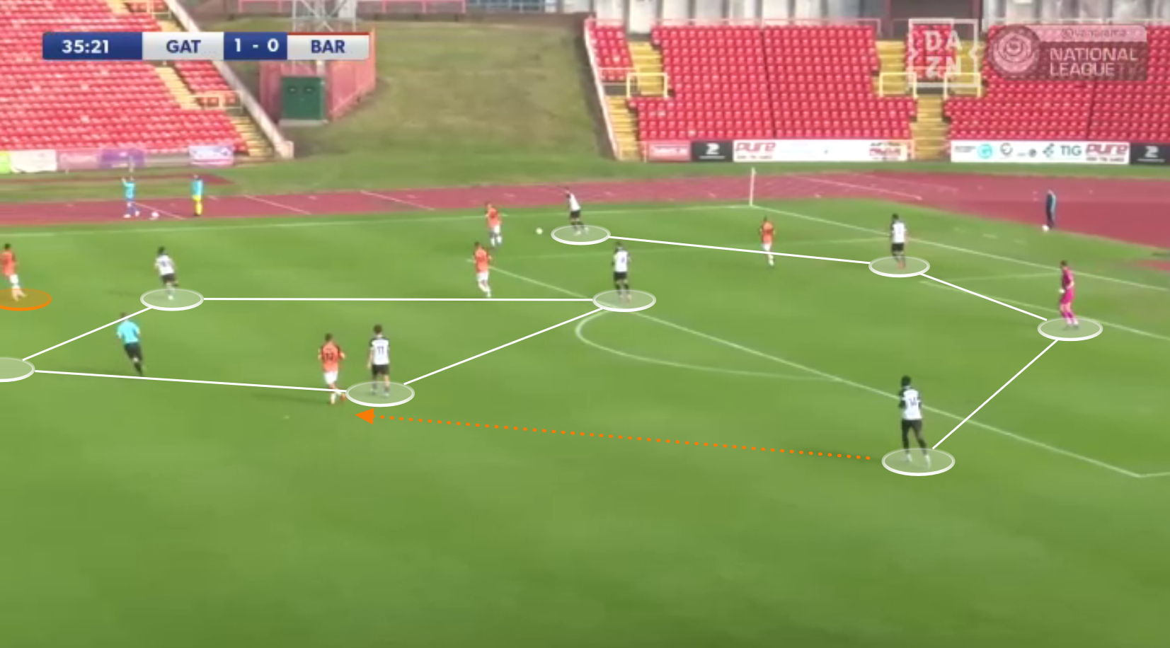 The difference, though, was that Barnet’s far-side #10 tucked inside to mark a Gateshead #8 (above). This left Gateshead’s far-side outside centre-back free, but he couldn’t be reached as play was on the other side of the pitch, and Barnet had applied good pressure on the ball. Consequently, Barnet had an additional player who could be positioned deeper to protect the defence. In this instance, Barnet had a 4v3 numerical advantage in the last line.