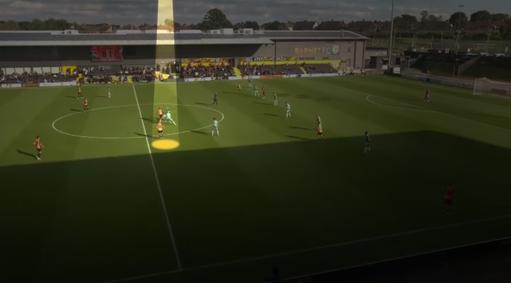 This is significant as it makes it more difficult for the opposition to force Barnet to build down one side of the pitch. If the goal-kick was taken short towards one of the outside centre-backs, it becomes easier for the opposition to limit Barnet’s passing options, and they would be more likely to either lose possession or ‘go long’ – which is chaotic as it would require them to win duels in order to retain possession. Additionally, with the goal-kick played into the centre-back, he is more likely to be able to pass or carry the ball safely into the midfield once pressure is applied to the goalkeeper.