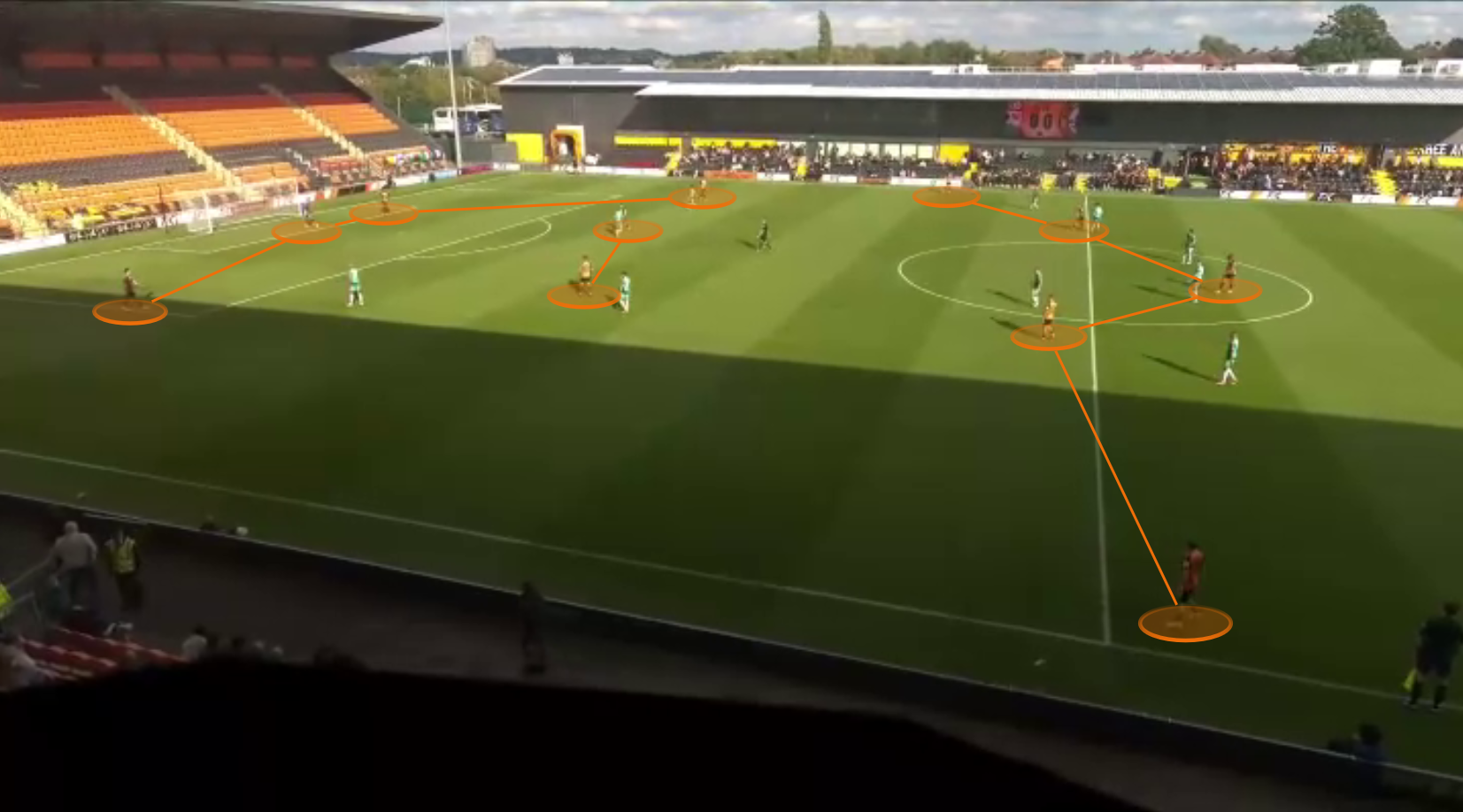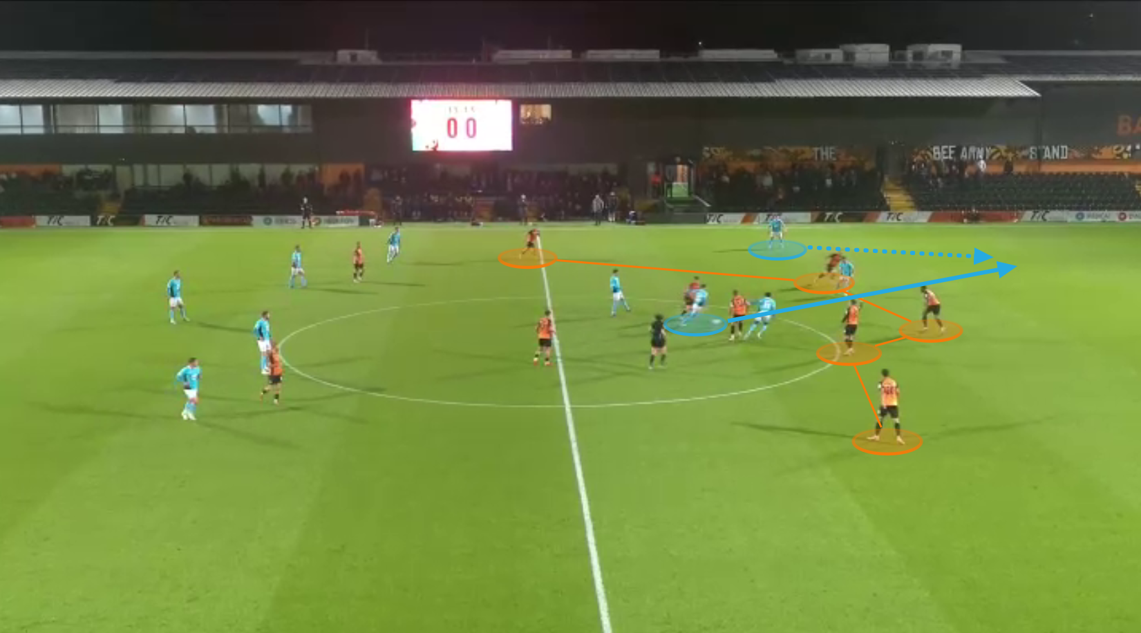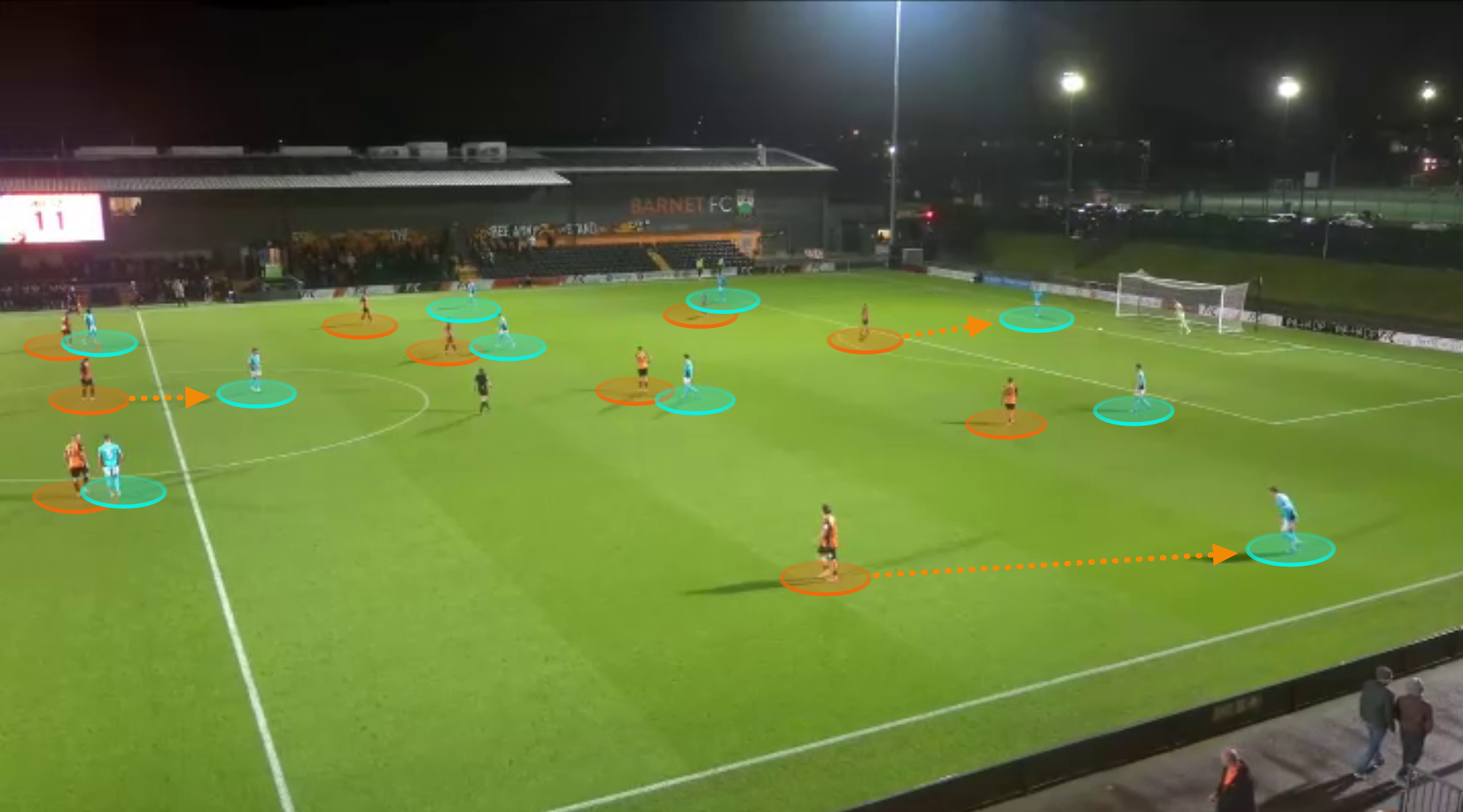 Hartigan’s passing range allows him to dictate the play from deep. He can either hit big switch passes into the wing-backs, who stretch the pitch horizontally by being positioned high and wide; or launch passes over and beyond the opposition for forward players to run onto, because Barnet also have players who can stretch the pitch vertically. Additionally, with there being fewer players centrally clogging up the midfield, it opens up passing lanes into the forward players, and there is an abundance of space available for the defenders to carry the ball into.