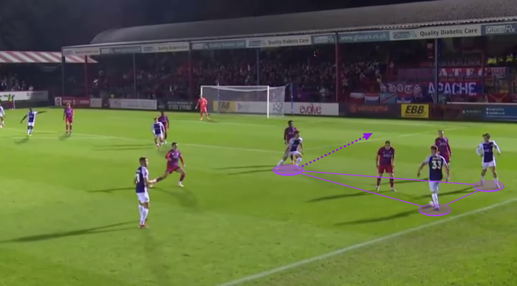 Below, versus Aldershot Town, Barnet managed to have three players close together on the right-side. This allowed them to rotate positionally – which is difficult to defend – and a pass was played in-behind the defensive line for a runner from the half-space to meet. From here, Barnet got themselves into a crossing position which Kabamba scored from.