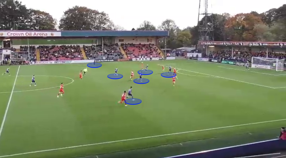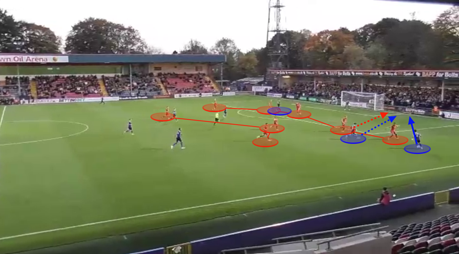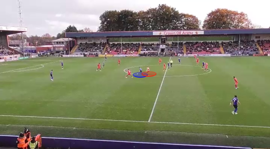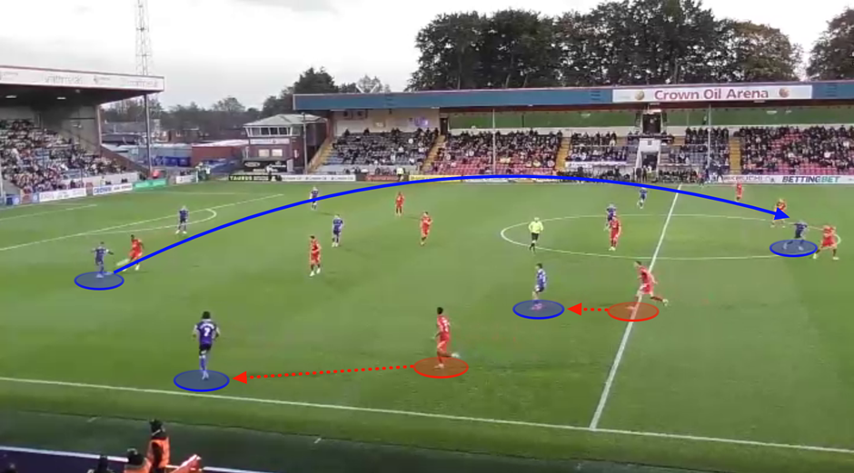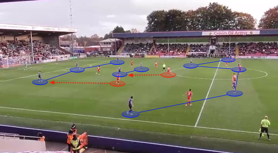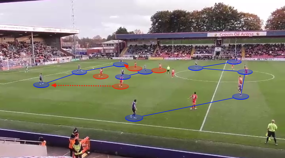 As we can see from the above image, if play went out to Rochdale’s left-sided centre-back, Sam Beckwith, Josh Walker would press him and the press was backed up by Oli Coker, who would tightly mark the pivot player who was previously being shadow-marked by Walker.