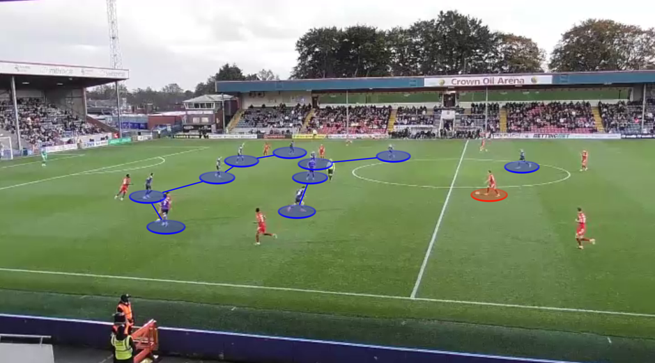 Because Southend’s back-five would often man-mark Rochdale’s front-five, it had the potential to be exploited, however. From the below image, we can see how Rochdale’s right wing-back and #10 had both dropped deeper, baiting two Southend defenders to press. This created space within Southend’s defensive line.