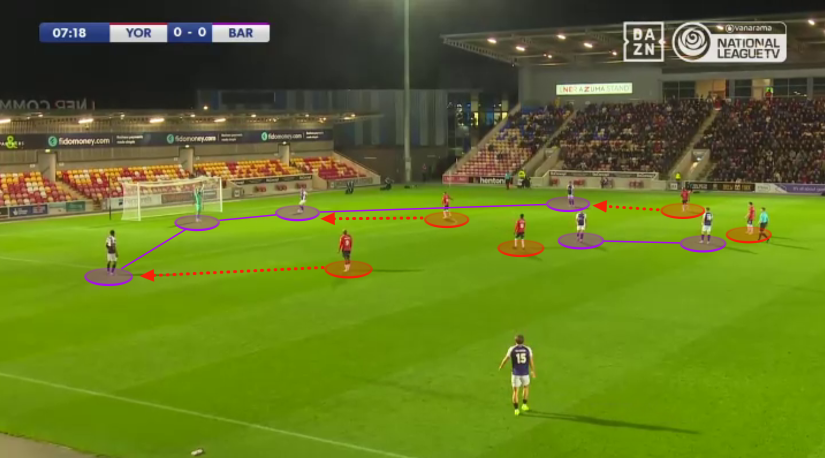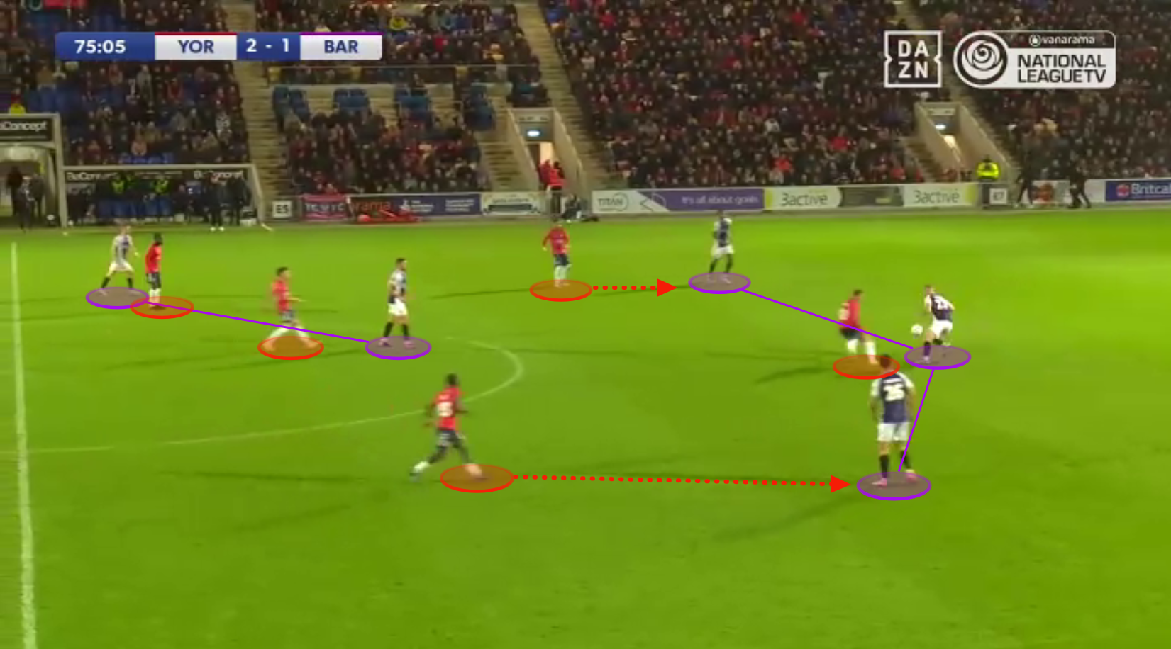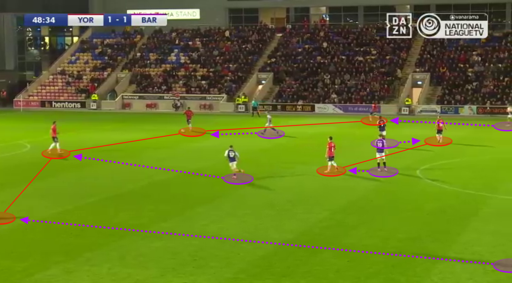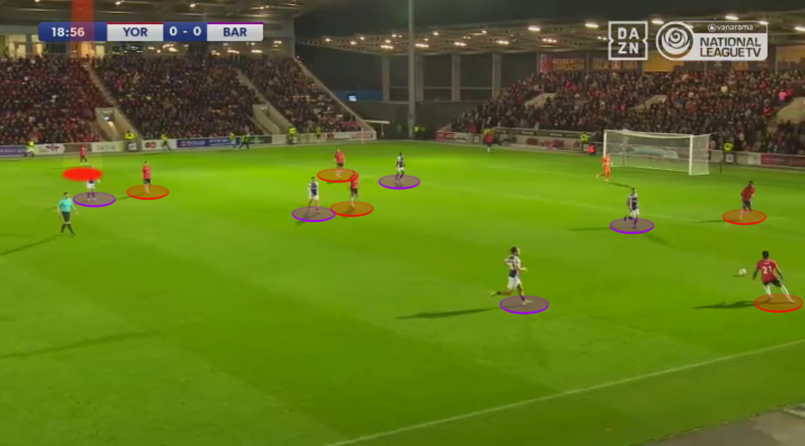 Additionally, Barnet required their wing-backs to cover a lot of ground to ‘jump’ to press York’s full-backs. However, if their wing-backs were unable to ‘jump’ they could be outnumbered 2v1 on the sides, and York could progress.